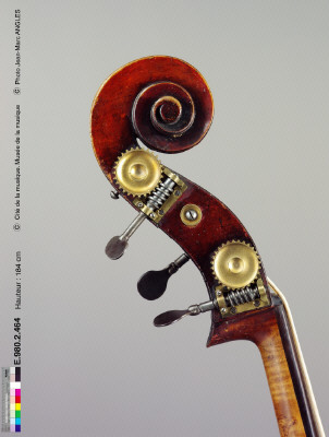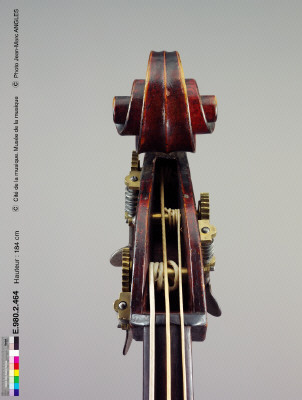 hello,this picture to "médiatheque cité de la musique" is a "copie Stradivairus" from JB Vuillaume...elle appartenais au bassiste Anglais Edward J. Merritt,le fond de la caisse Ã* été agrandi par Gand et Bernardel ,j'ai moi meme une Vuillaume dont voici des photos