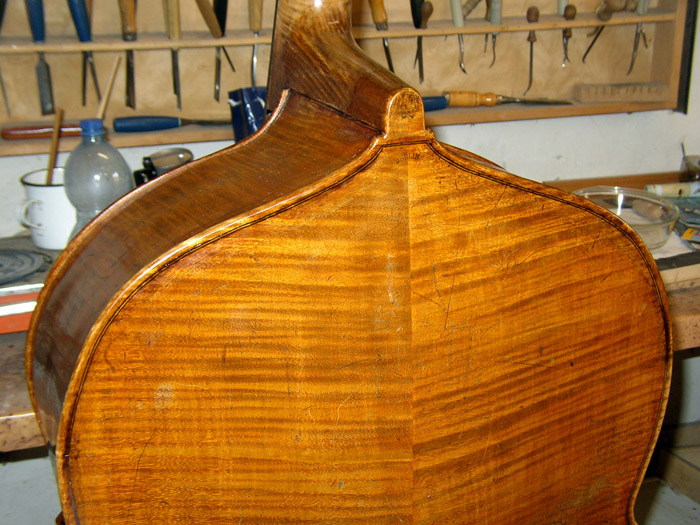 I saw and played one a few years ago in London....a dealer friend of mine had one. It was labeled 1890 Luis Lowendall - Berlin, and also fire stamped on the back button. It was a gorgeous cello model full size. It sounded great ! I was about to buy it but then I passed on it because of the cello shoulders...Recently I've found photos of that same bass being altered (shoulders reduced)...here we go : great job !
