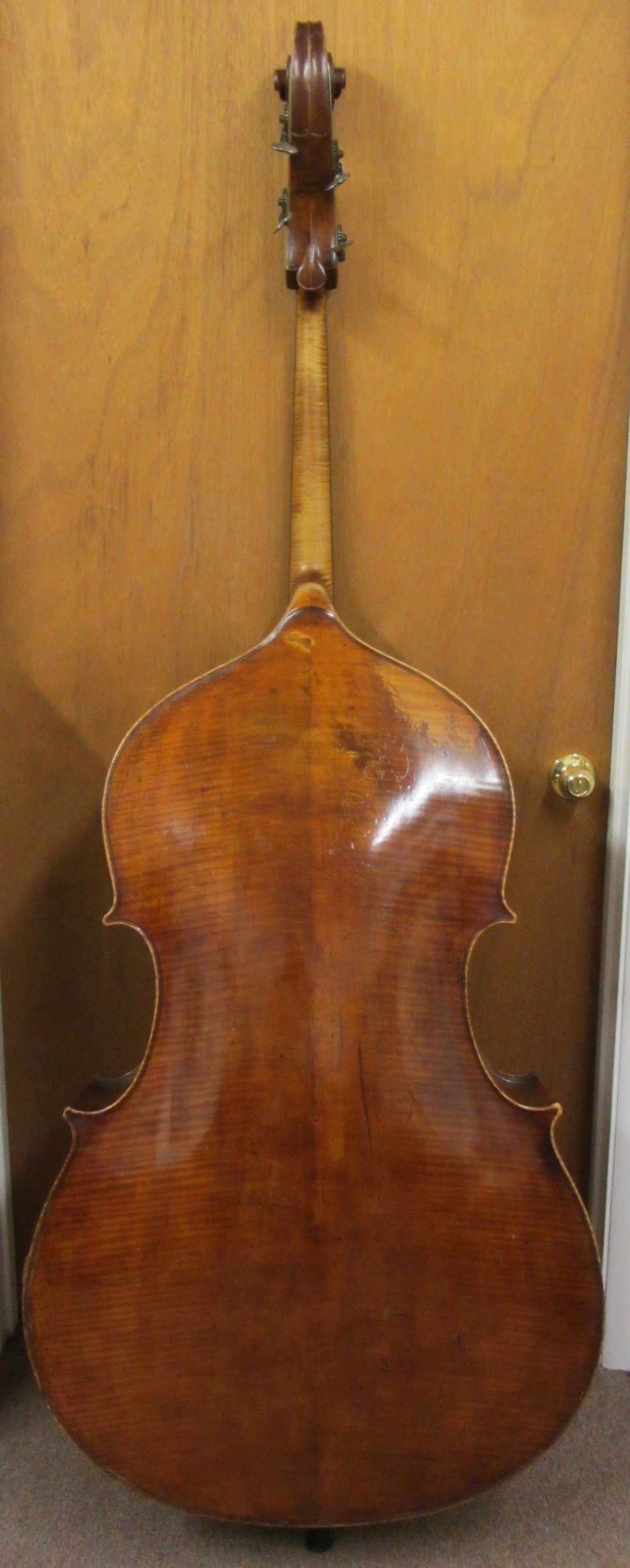 This is a 7/8ths (or 4/4 size of its time), 'BERLIN' stamped in the upper back button. Beautiful reddish brown varnish (the red well faded), 41 7/8" string length with a grafted neck, original scroll and gears with slight scars from a previous mechanical C-Extension. Wide lower bouts (28"), deep ribs (8 5/8") w/outer linings, slightly sloped shoulders and easy to play. Well arched round back tapered in the upper bout towards the neck, ribs are 6 1/4" wide at neck. Well flamed maple throughout with fine-medium grained spruce top. Deep warm tone with good projecting power.