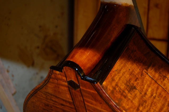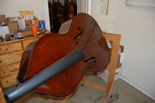 Ok, here's a few pics of the Bass during the Varnish touch-up stage that Arnold just sent me. I have several pics of the repair process but like watching a Heart Transplant, some internal operative pics are not for the faint!