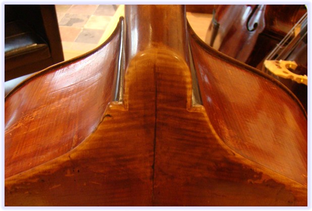 I doubt the Scroll is as old as the Bass and is a northern Scroll as well to me. Maybe Markneukirchen 100-120 years old. I have seen others like it and the gears a well. The Back shows signs of a Neck/Heel break in the past. This Scroll as well was once pinned through the button and then maybe a new neck grafted after that failed. The Bass sounds great and I can only assume it was heavily used because of its sound. It is one of the best German Basses I have ever played. On the Linings, the blocks at the bottom bout are cut and the lining butted up against the notch, the same on both sides. The middle bout linings are flush, not inlaid as are the upper linings into the upper blocks. Only the lower back side bottom block are notched. One side it goes in and one was trimmed back. There is a center crossbar 3" in width, a lower crossbar shaped like a bassbar, a middle crossbar shaped like a bassbar and an upper one covering the angle-break that is a flatter bar but rounded softly about 2" wide. There are many repairs inside the back as you can see the numerous splits in the Birdseye. I am just now dropping some glue on a lower crack inside that has no visible repair to it. When the bass goes this Summer to Jeff Bollbach, I will have him put some linen over it and go over the whole bass. It looks like the repairs are several years old and may need a touch of fresh glue in a few spots. I don't think the bass needs to come apart at this time. Jeff, if you hadn't asked me to look inside at the back construction I would have not seen that faint un-repaired crack. Thanks.. ![]() The shoulders of this Bass slope a bit more than some other Mittenwalds but then again, there were several shops and makers in the 19th century making basses and/or producing parts for them. The red varnish over the yellow under it is also common with Mittenwald basses. Quote: