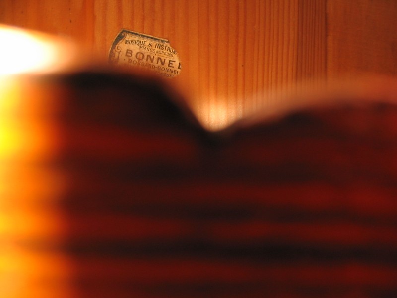 There is a faint stamp in the back that's impossible to make out and a partial label that says "Bonne..." The stamp looks like it's from a general musical instrument shop. Pianos, organs, etc.