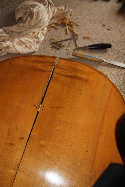 Now what route to take.... full center seam inlay ??? Due to massive peer pressure I will replace the back brace . Any advice on how many braces the bass will need , Im guessing 3 or will sturdy patches along the centre seam be an option ...? |