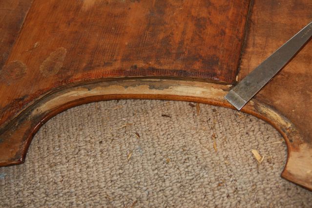 The back fit is textbook ie a healthy amount of overhang all round . If I clamp the neck and end blocks to the back it maintains perfect symmetry so I believe that with an extra pair of helping hands I will get the fit correct without having to apply unnecessary distortion to the ribs. The gap you see at the lower bout join was originally filled with some wood that I removed / the gap must have been man made to try and cover up for some damage or something / i.e it is not caused by shrinkage etc.. My question is do I refill the gap with wood as was or plane the gap to an even width and insert a strip like on the pic Ken posted . Obviously cosmetically the latter is the proper option or ? |