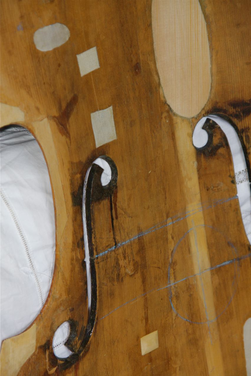 I have just started the top repair with a bass bar patch as the crack was really jagged and totally messy. Ill leave the final shaping of the inlay for when the bar is ready to shape.
