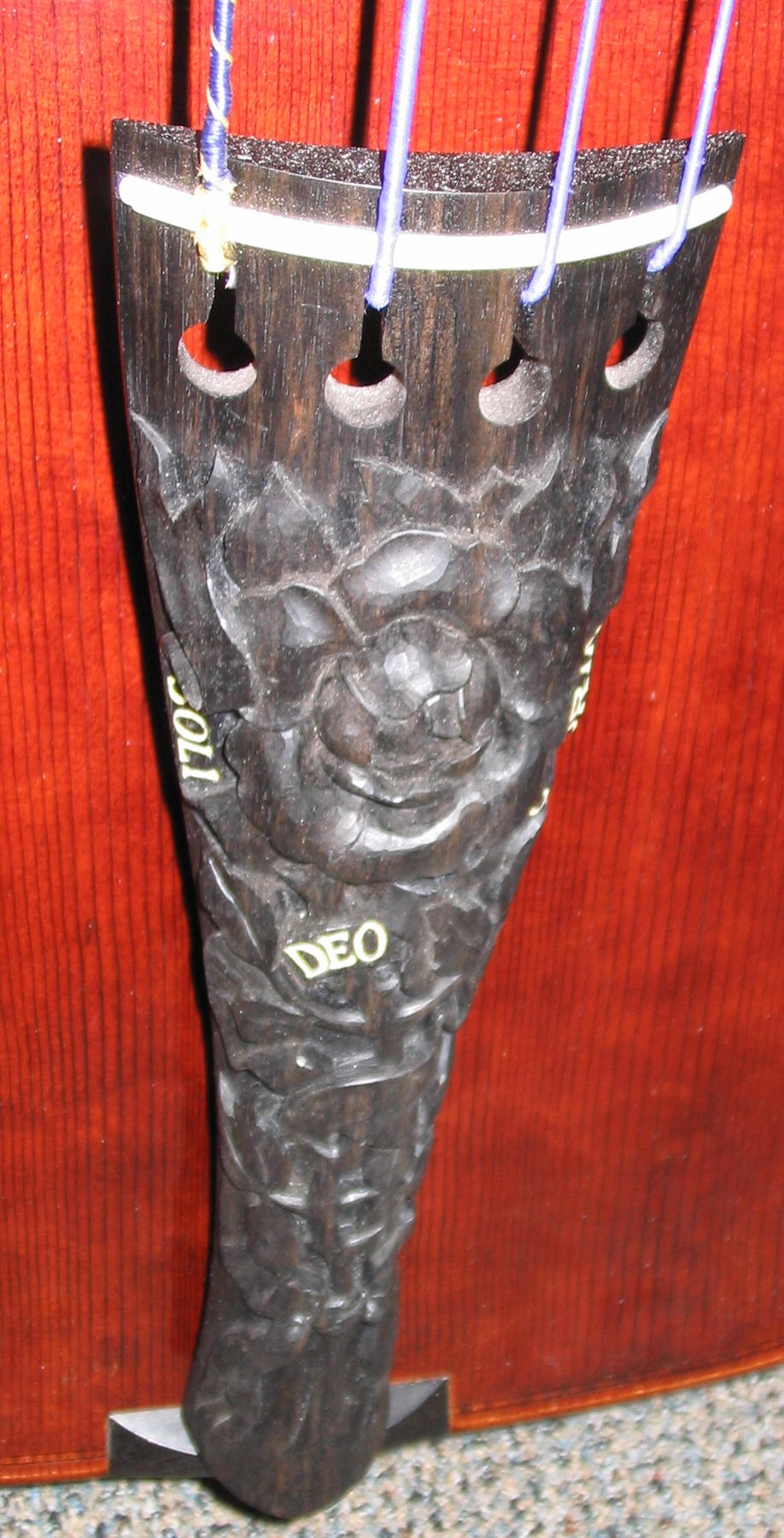 Here's a nice carved tailpiece by gold medal bass maker Dan Hachez.