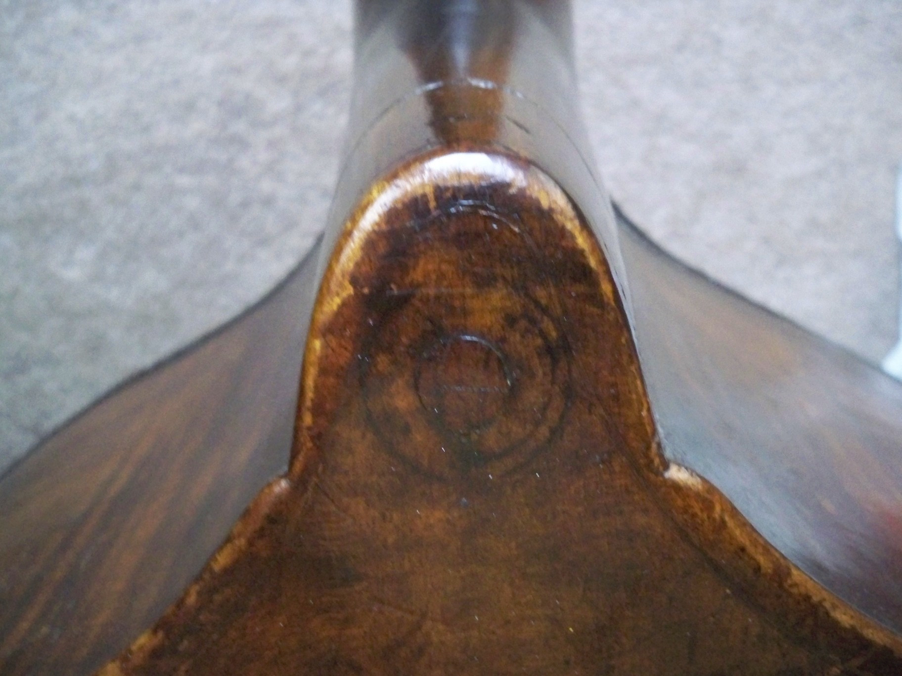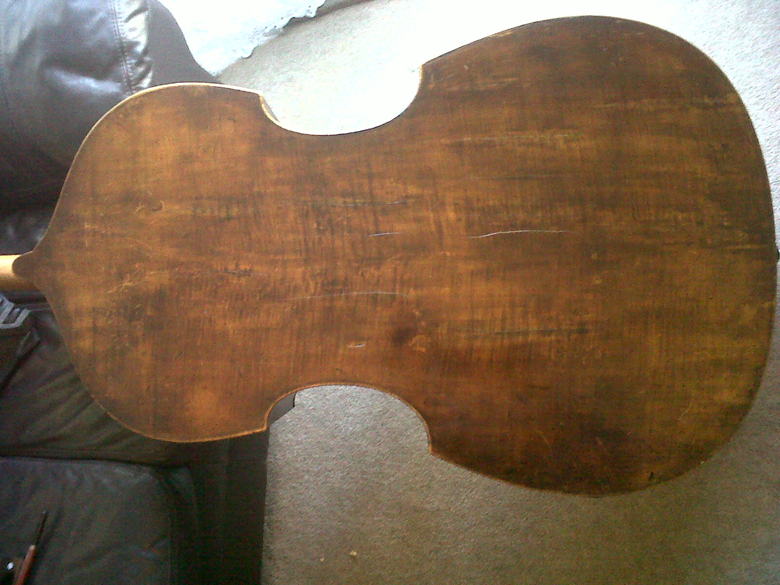 Thanks for your interest,I tried my best with a magnifying glass and took a few more pics in different lights (tried even different filters in Aperture),but I cannot really find any letters...at 2 o'clock there almost is some writing..other questionmarks,are the tuning keys original,there seems to be old holes that have been filled.. A friend mine of suspects this to be a Bohemian bass,and it looks very similar(to me)than the one you've sold on your double bass department.. |