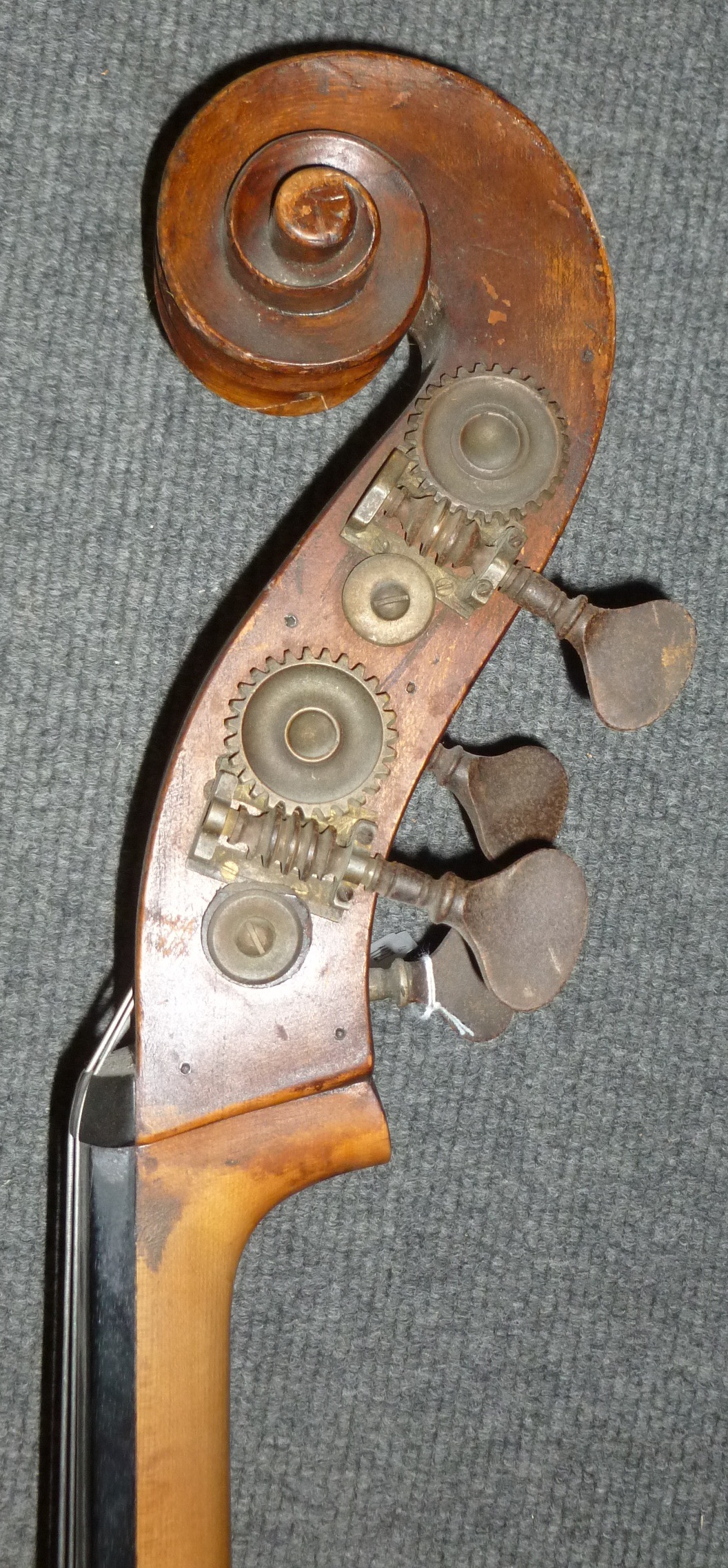 I agree.. Commercial German/Czech style bass that had plate tuners before these Mirecourt gears which, might be older than the bass. Maybe, maybe not. The top looks to be possibly re-finished as it has a smeared look to it. That is usually a bad sign of something that was covered up for whatever reason or, just a bad choice to do so.
