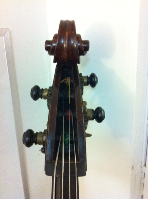 Consignment customer calls this an "Austrian bass, ca. 1890". My guess is Tyrolean, pre-WWII, but I can't say whether or not it could be pre-1900. It would be in extraordinarily good condition to be as old as it's said to be. Exterior linings, genuine (if smallish) bass bar, real purfling, bass has been revarnished from original dark brown with the purplish-black hue seen on Viennese instruments. Oak neck. Overall a bit more nicely made than the average Tyrolean I see. Plates are not overly thin nor is the top excessively arched. No notable deformation of the top though it could possibly have been re-arched some time ago. Big, lush sound, as you'd kinda expect. We had a similar bass through the shop that was reliably dated ca. 1920. Do you see anything that would indicate this bass is older than that? Thanks in advance for any notes!