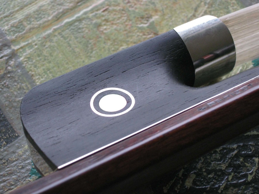 Amazingly, that is the original frog, rebuilt, re-machined (with a custom milling machine tool, made for the frog), with new wood only added as needed. The "chevals" added to replace damaged ebony (as I have learned they are called), are essentially undetectable, even under close scrutiny. Naturally, there is the faintest shift in grain direction. The glue lines themselves are completely invisible. I am attaching some closeups. He made a new button, underslide, inlays, and French Eyes. I am including a shot of the mangled originals, which he returned to me. The milling cutter for remachining the frog is in the photo's upper right corner. He upgraded the mountings from the original nickel to silver. He also picked some really stunning inlay material; which is a touch more dramatic than the originals, which were blandly figured. Apparently, he routinely makes new frogs for people who use older bows, so that the bow can be in action without the frog being at risk. He offered me the option of rebuilding or making a matching frog. I took him up on his offer to rebuild. It is nothing short of amazing, from a couple of inches away. Here's an article he wrote, with photos, on replacing a broken tongue: http://www.wepapers.com/Papers/11054...iolin_Bow_Frog He also filled the stick and removed all traces of the accident. Before this work, it looked as if an enthusiastic dog had been allowed to chew on it for an hour or so. Let's just say that having the stick run over by countless automobiles and trucks, on a paved street, did it no good...miraculously, the stick itself was not broken. Perhaps the bow case helped a tiny bit, before the bow was actually out of the case, lying on the asphalt... Last edited by Eric Swanson; 04-23-2011 at 01:13 PM. |