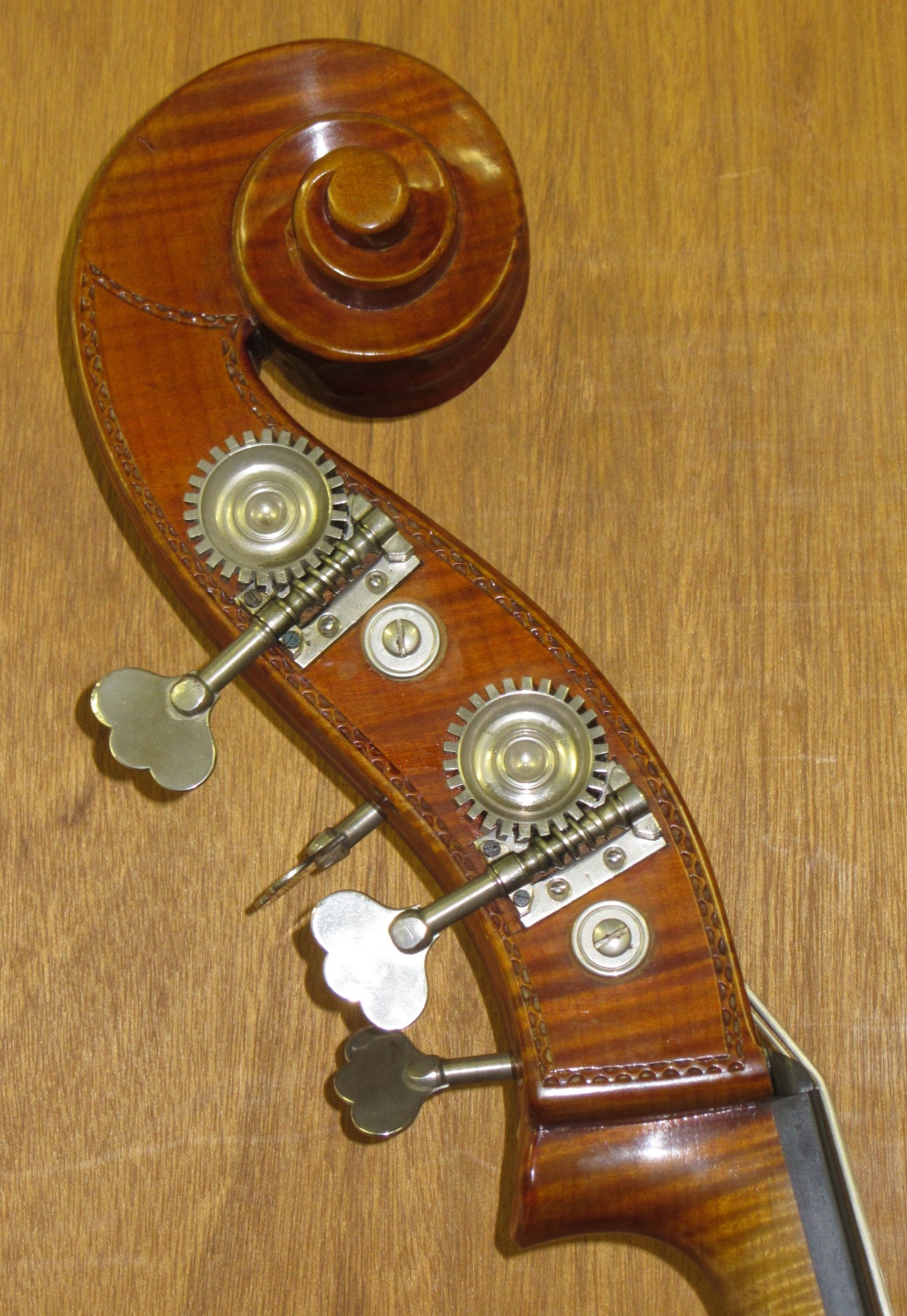 Here is a beautiful engraved 3/4 Pollmann *Busseto model with *'lower rounded corners' from 1970 in near mint condition. This Bass is a joy to play, the sound is huge and of course the bass is stunning to look at. Only the best and most attractive materials were used to make this Bass.