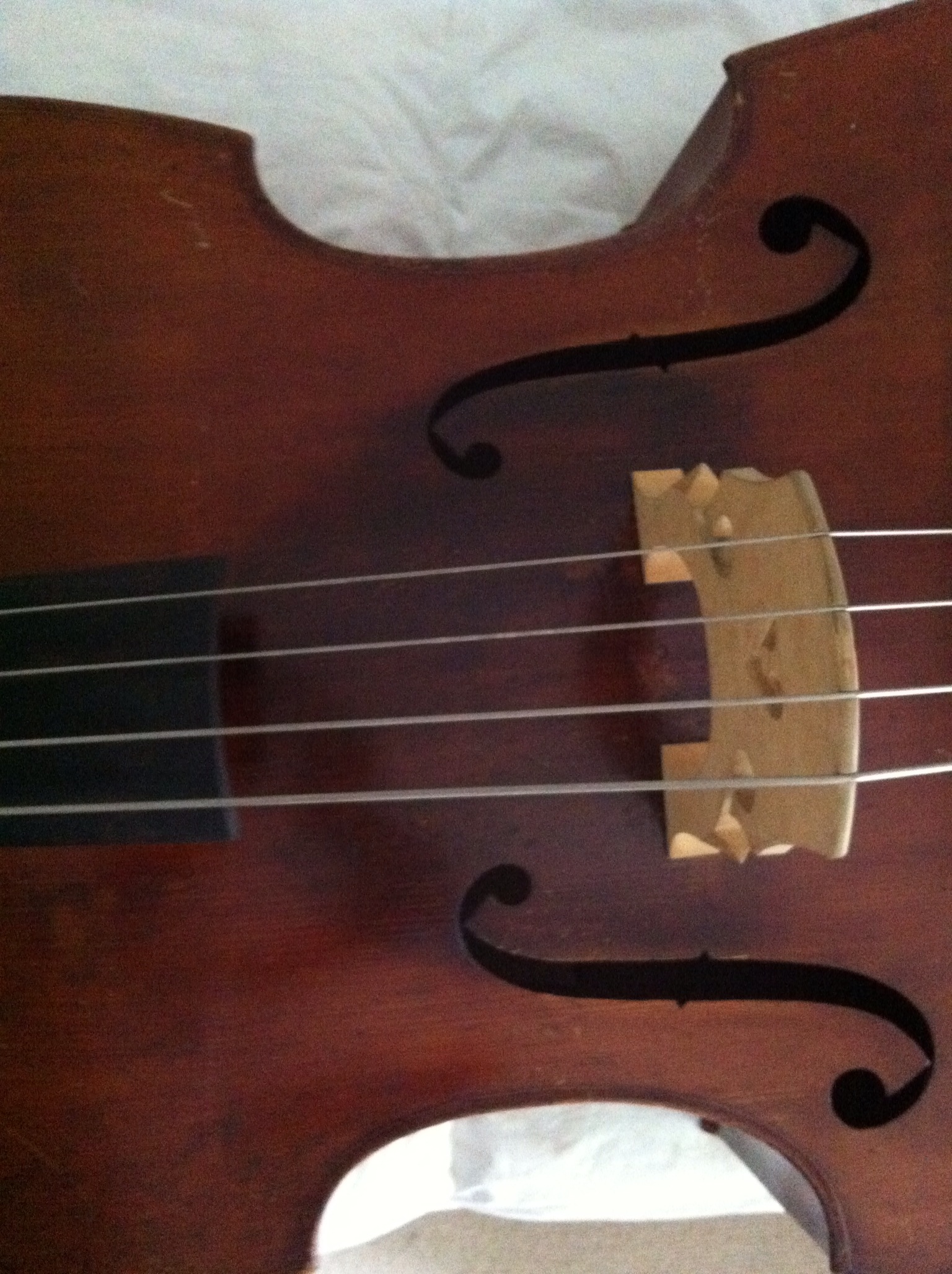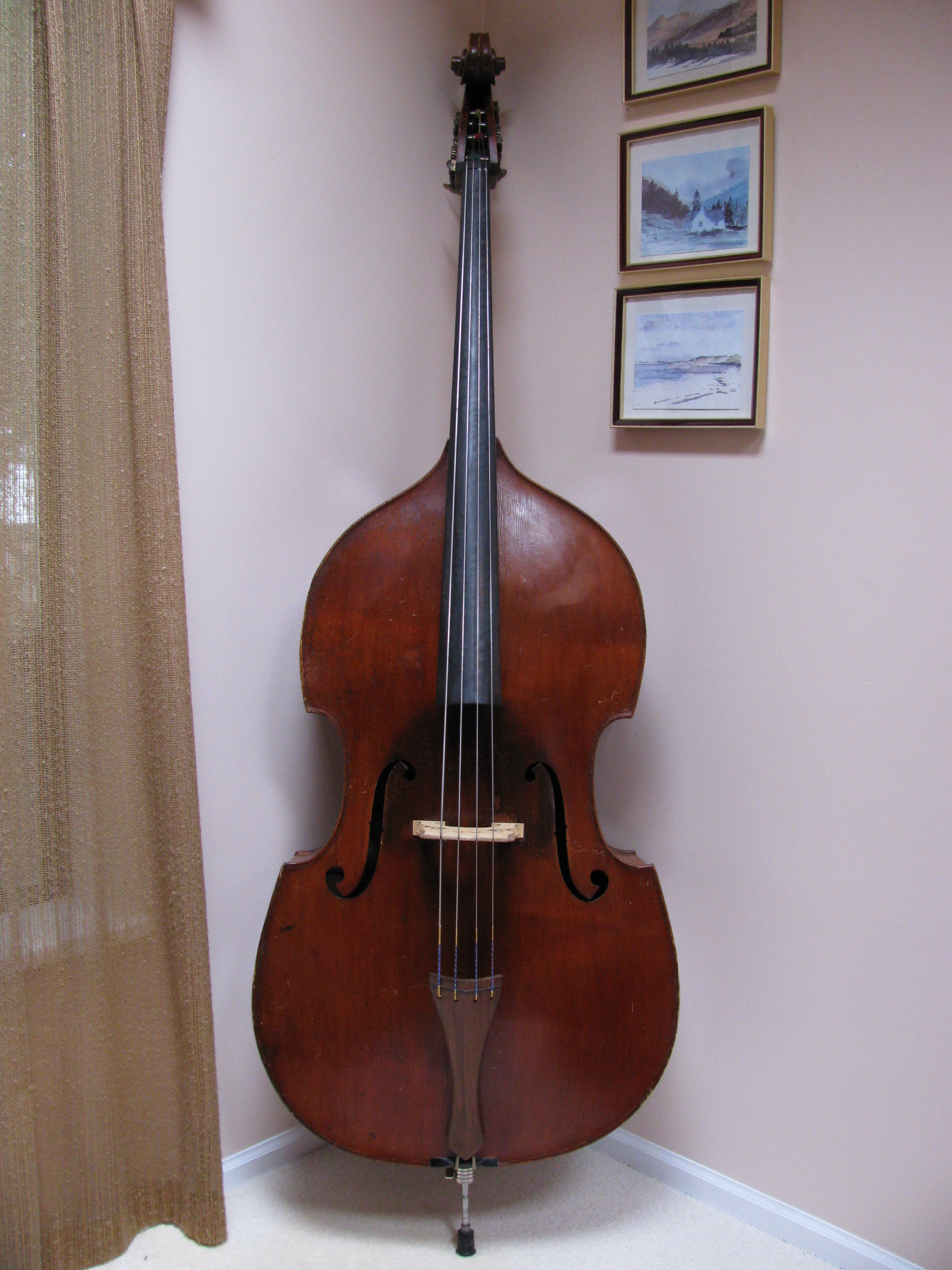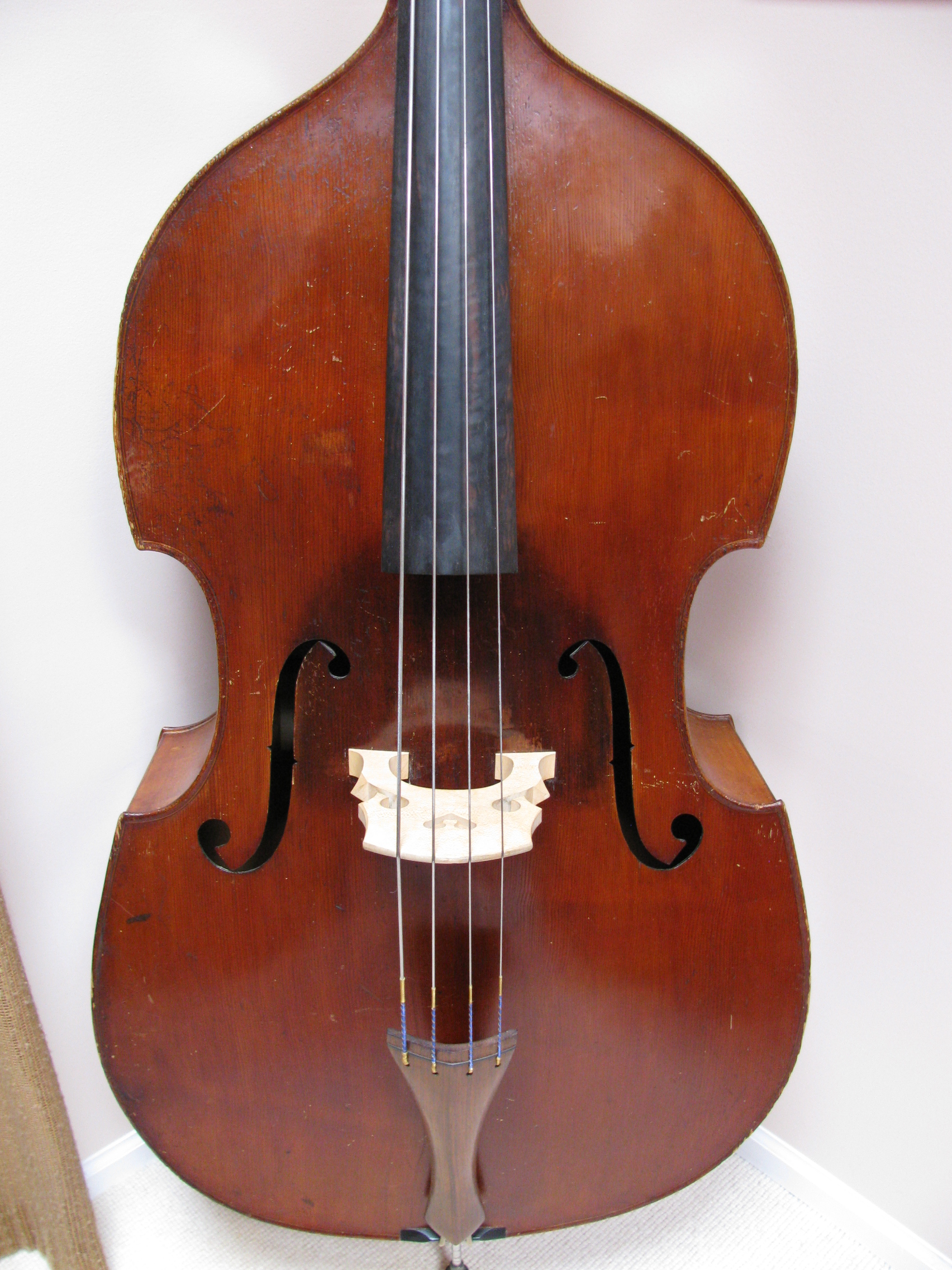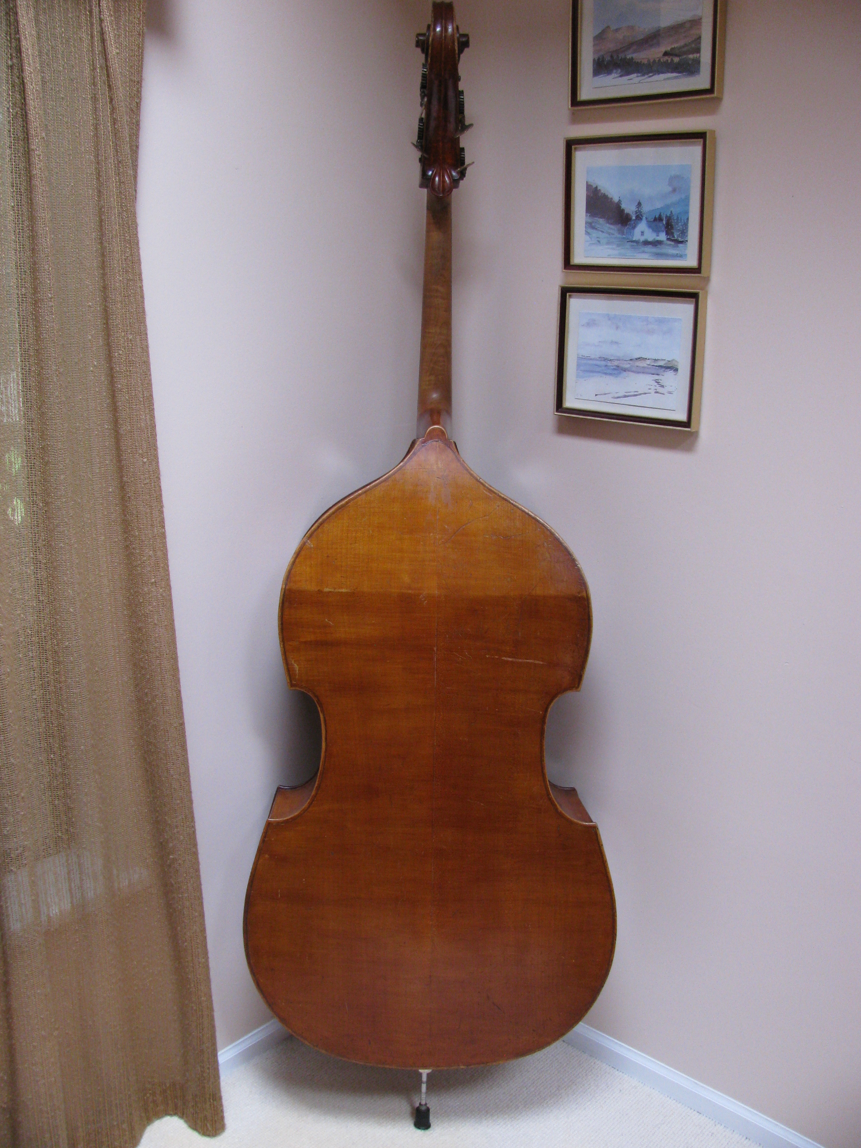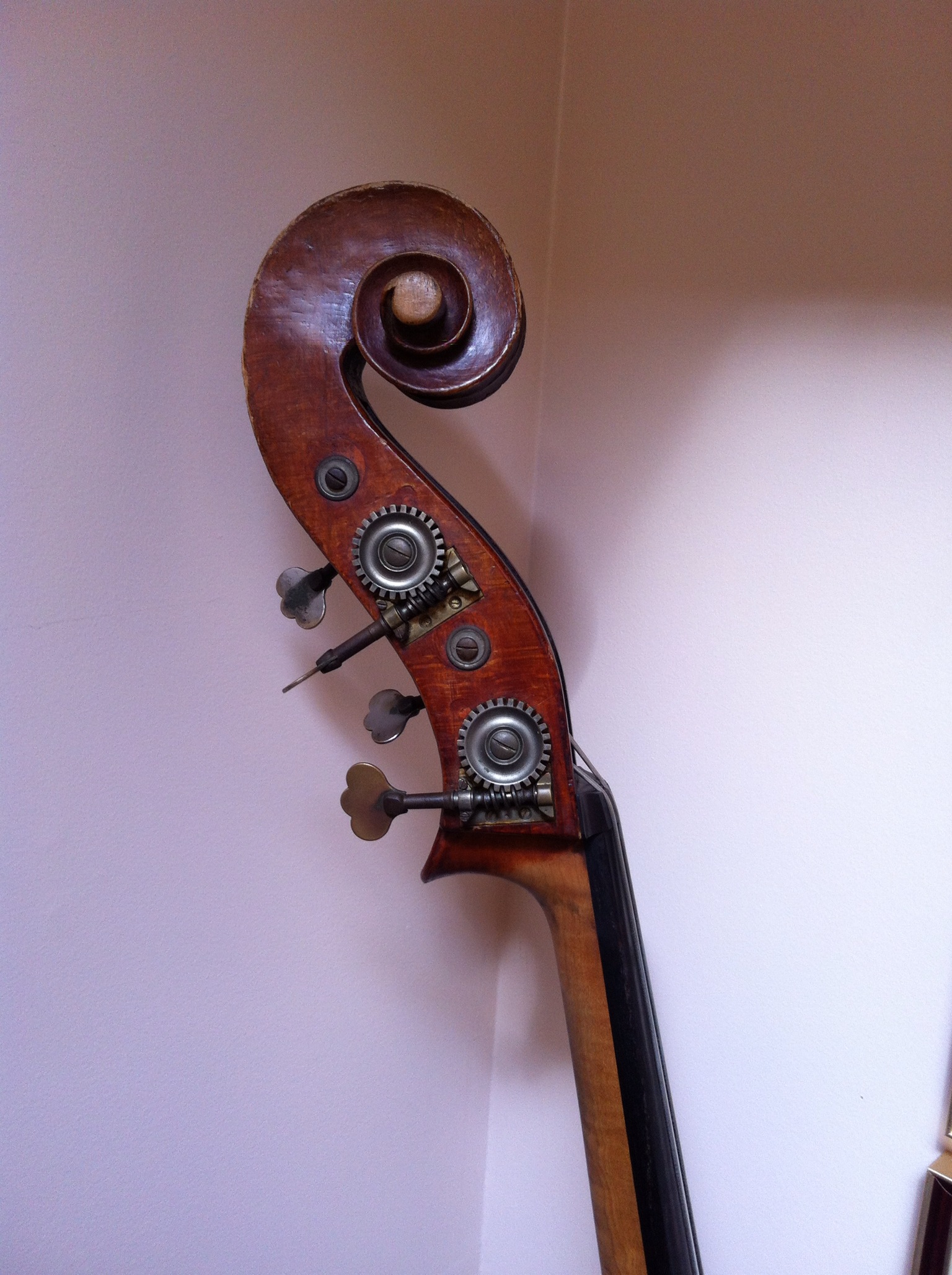 The Gears are German and possibly the scroll. If these two are original to the bass then probably it's German. Also, basses from this period from France and almost all of the French basses never have an angled flatback. I have only seen a couple of them that had that style back and they were either very old, modified/cut or, just rare if not incorrectly attributed. You can still respect your luthier but on this bass, I think it is German. If it is French by the other two guys please tell me from them what maker or shop made basses like this and when. Also, on the gears, I can see these were replaced but the plugs on the pegbox are large as if to cover up holes from hatpeg gears. I have never seen a French bass with hatpegs. The 3 main things that usually rule out a french bass from the 19th-20th century are; 1-Hatpeg gears 2-outer rib linings 3-angled flat back Not all German basses are factory looking. Besides Germany and France, basses were also made in Belgium, Spain, Netherlands, Sweden and other surrounding countries. You almost NEVER hear anyone say they have a bass from one of these lesser known producers of string instruments. It could be one of those rare turn of the century French basses that look German but usually it's the other way around. |