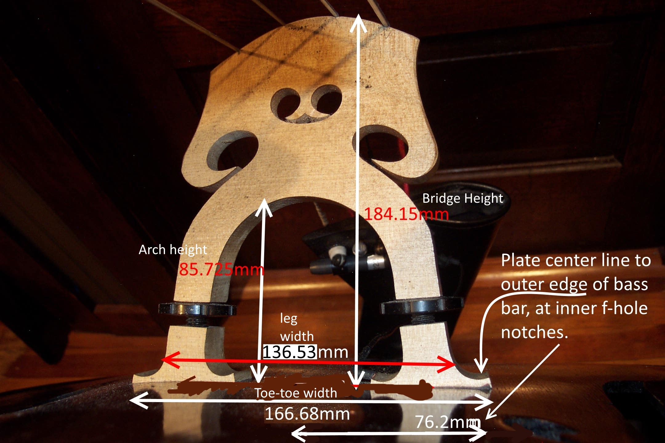 I'm contemplating a new bridge for my big Romanian flatback (42" scale). Currently the bridge leg is well inside the CL of the bass bar. See attached images for measurements. If I center the leg over the bass bar, than the toes will likely over hang the f-hole eyes.