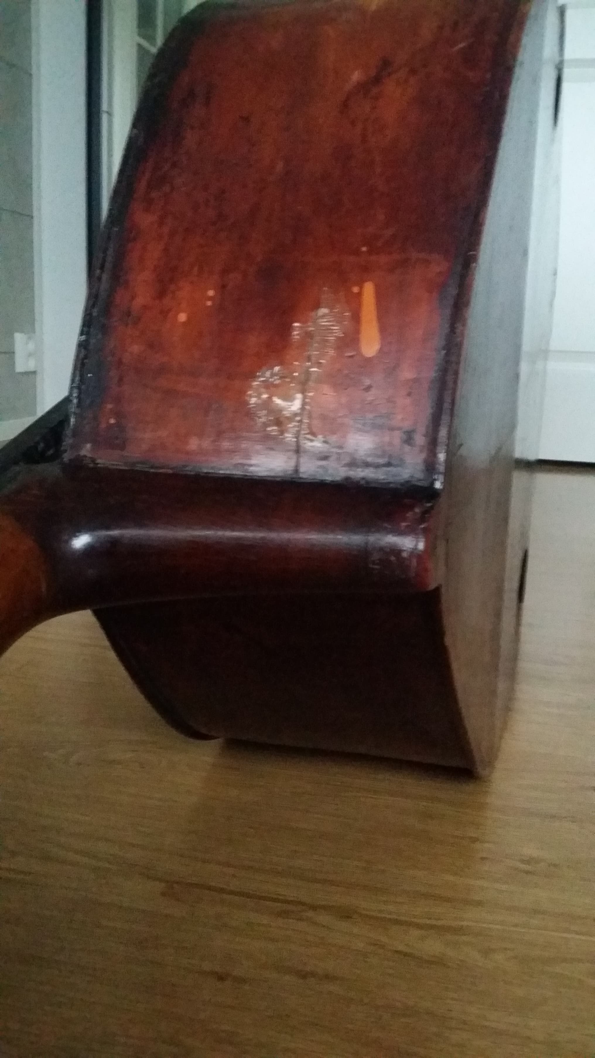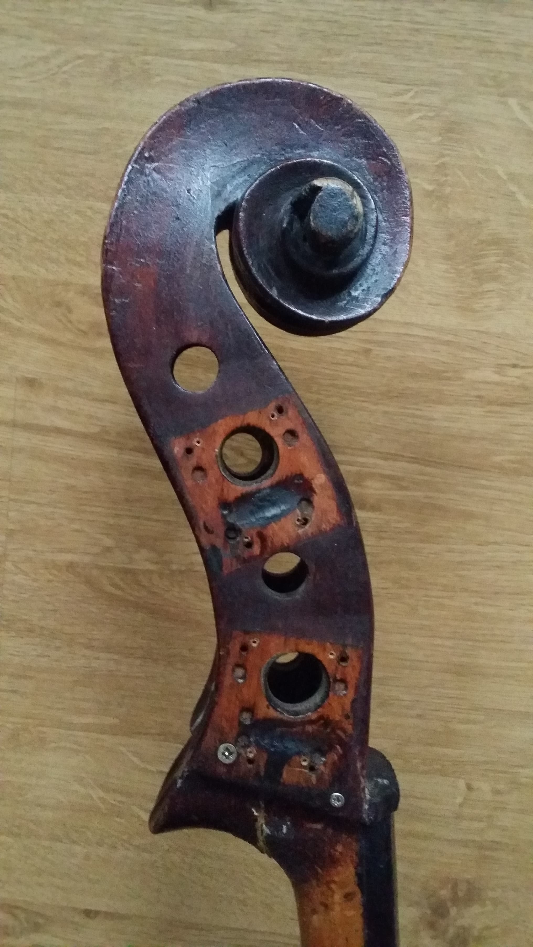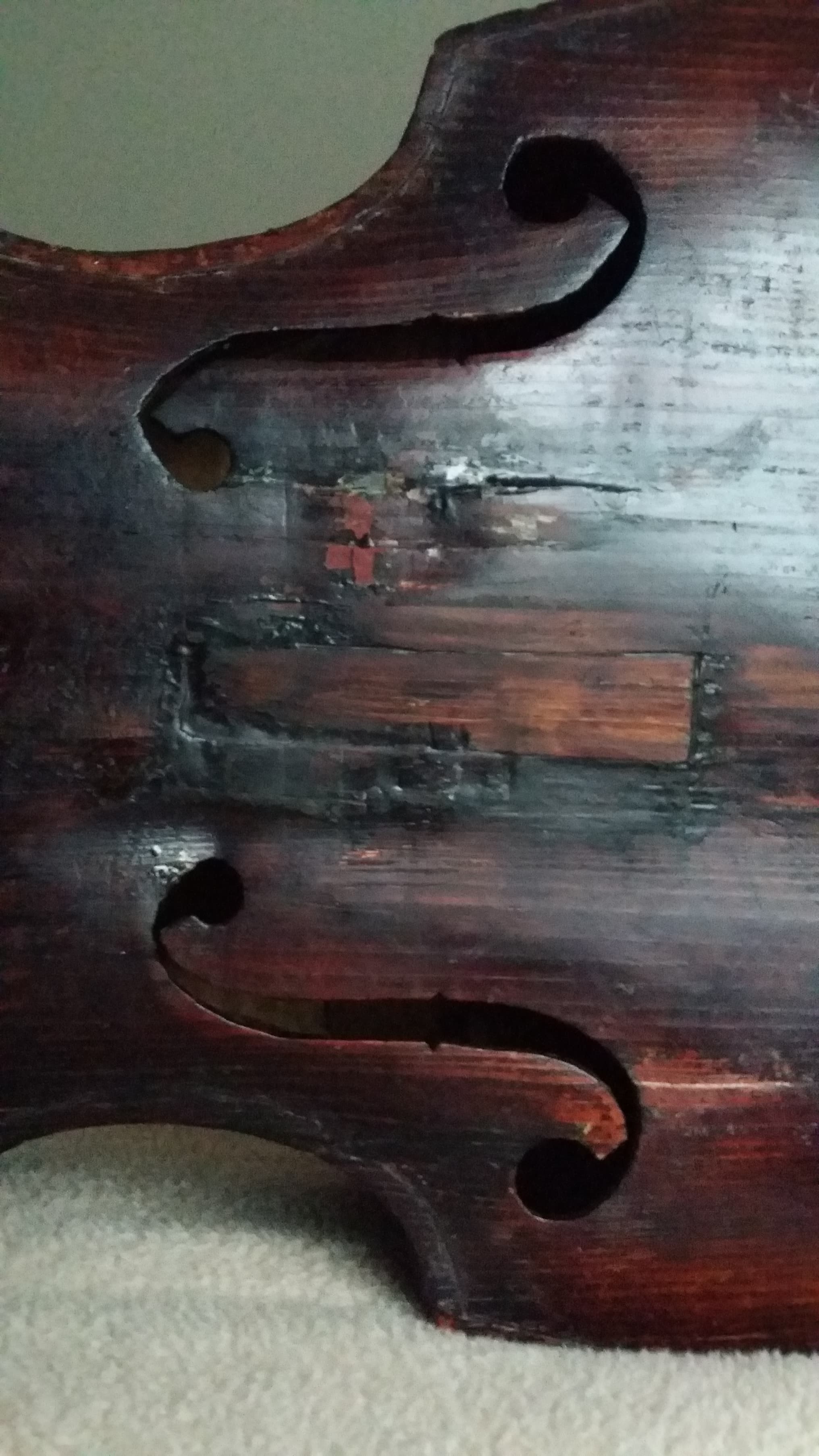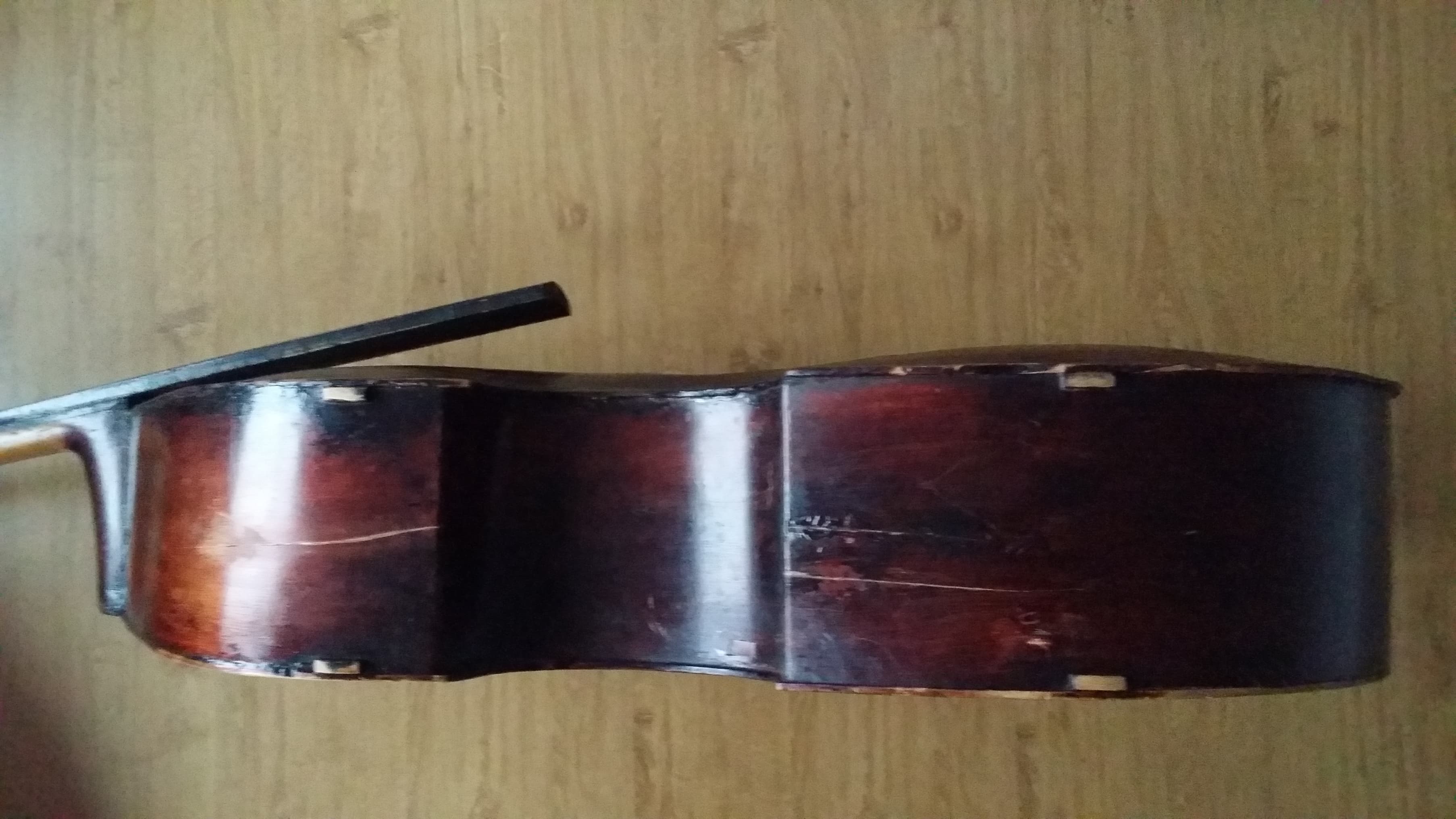 It's in horrible shape. Especially the top which has caved in...a lot. Very thin in some areas and bass bar is incredibly small or at least incredibly thin. Maybe half the thickness of the bass bar in my main instrument. There's a ton of really crappy "repairs". Worst one (and there are many bad ones) must be a rectangular patch in the middle of the top that somone seemed to think would stabilize it.