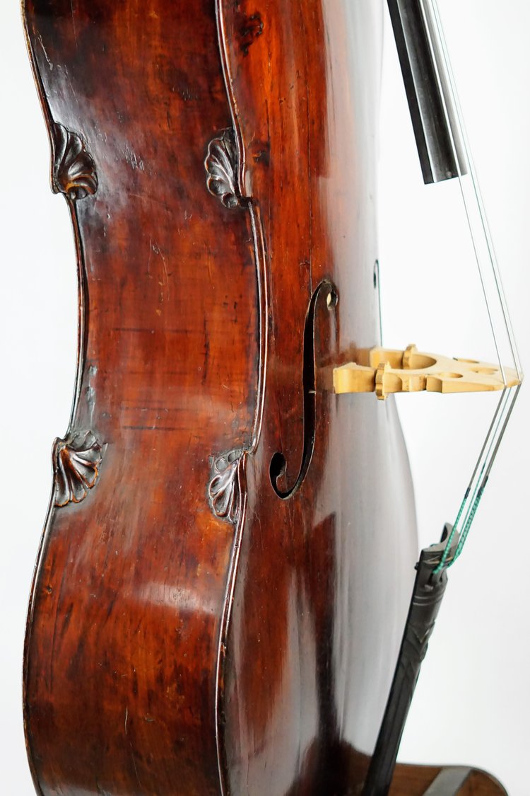 This is a Beautiful old Italian bass made in the Guitar Style but with Violin Corners and added Scalloped Blocks on the Ribs of each of the 8 corners. This 3/4 bass has been played and admired by many great players including Leon Bosch, Stefano Sciascia and Gary Karr, the latter two favoring smaller Basses like this. This bass is extremely versatile having been used for Chamber music, Jazz w/Orchestra amplified, Orchestra section, Pit Orchestra w/amp and excellent for Solo performance as well, fulfilling the needs of any size ensemble or venue. String Length is 41" (104.1cm).