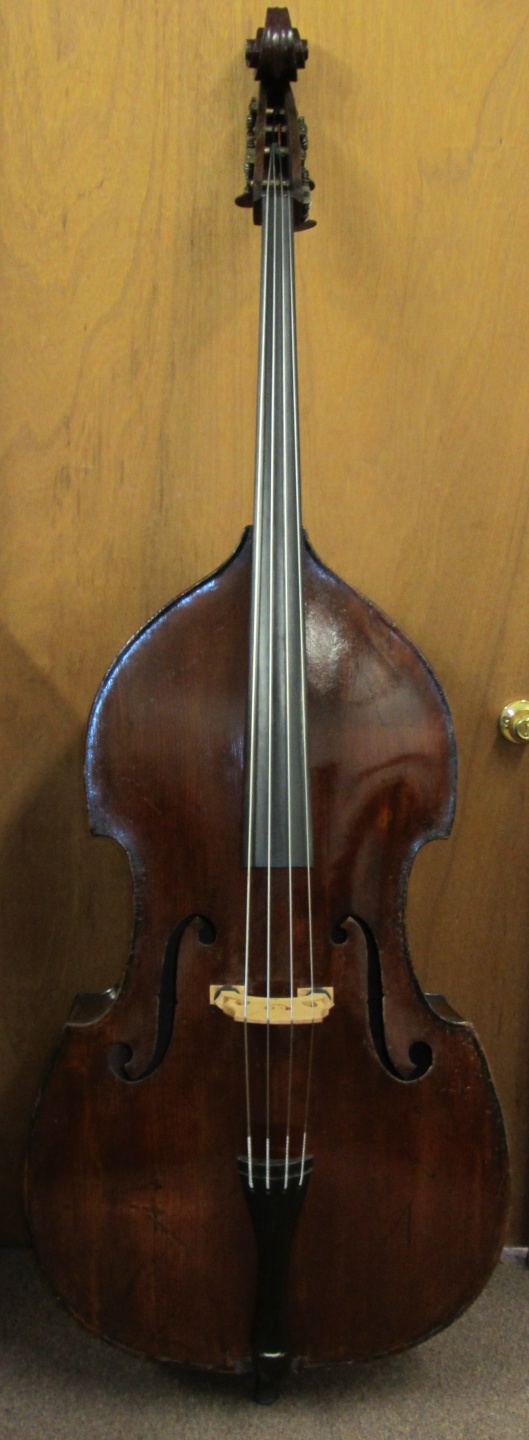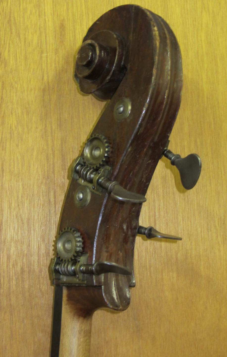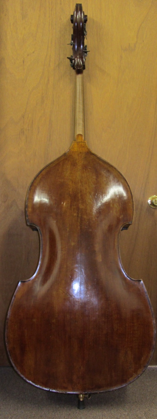 Here we have a beautiful old turn of the century French bass from the shop of Paul Mangenot, pupil and successor to Justin Derazey. Although unlabelled, I have seen at least two others labelled and a few that were not. All of them have the same distinct look from the model, wood and varnish. This bass is in fine restored condition and has a modern set-up with new fingerboard, bridge, sound-post and end-pin unit. The Top is Spruce. The Back, Ribs and Neck/Scroll are Beech-wood, all original including the Gears and Varnish.