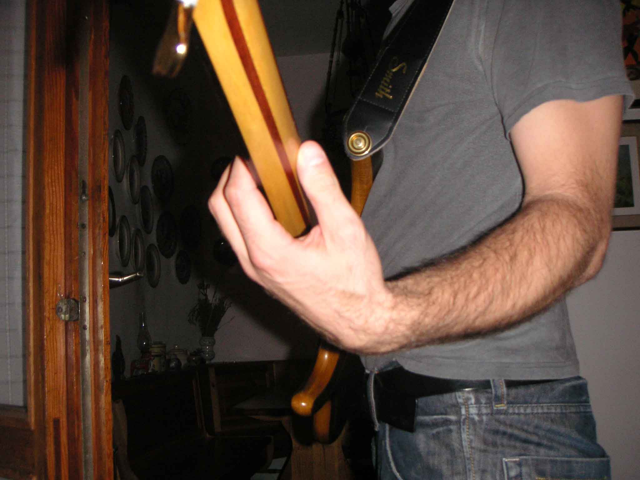 I'm not that idiot! ![]() I maybe didn't explain well. what I need for a correct left wrist position is fingerbord surface parallel to my body, like when you play sit. if the fingerbord is facing up when you strap it on it will be harder to play and can take to wrist healt problems because you'll have to bend your left wrist much more to reach the lower strings It really makes a lot of difference to me, that's why I'd like to know Ken's opinion about that I hope I sayd that clear now. (i'm sorry for my bad english) |