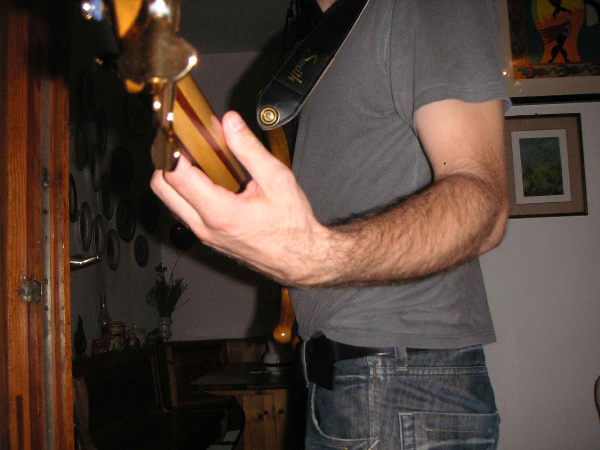 A little example test. Stomach or not if you wear your bass and stand up the bottom edge of your bass will not touch your body.. this won't happen with basses with the straplock in the center of the body like the Yamaha trb6 or I played for long time or almost every bass on the market. (this is probably why I noticed that) ok I did some picture to explain my point: Look at the angle between the bass and the line of the wall behind: or the door here (notice Clifford Brown and the Double Bass bridge in the background..) I don't have a goniometer here but this is almost 15 degrees now see the reduced angle after the modification Now my bass feels really good on my body.. Then this is a pic of my wrist when playing on the E string with the normal Smith strap position you can also see very well that the bass is not straight vertical here, as you can notice when you wear your own Smith Then here the more healty reduced wrist angle with the new strap position. I don't want to look assumptive with that but I've been very careful to posture problems this years after a bad wrist problem and I think this can really help someone. than my beautiful smith feels so much better and easyer to play now.. Please don't think this is a criticism. I think the Smith is by far the best bass ever built and I just love it. It was hard to decide to drill a new hole in my beloved bass, but the result looks very good and I'll fill the original hole with another identical Dunlop straplock.. Last edited by Roberto Zecchinelli; 08-16-2007 at 07:50 PM. |