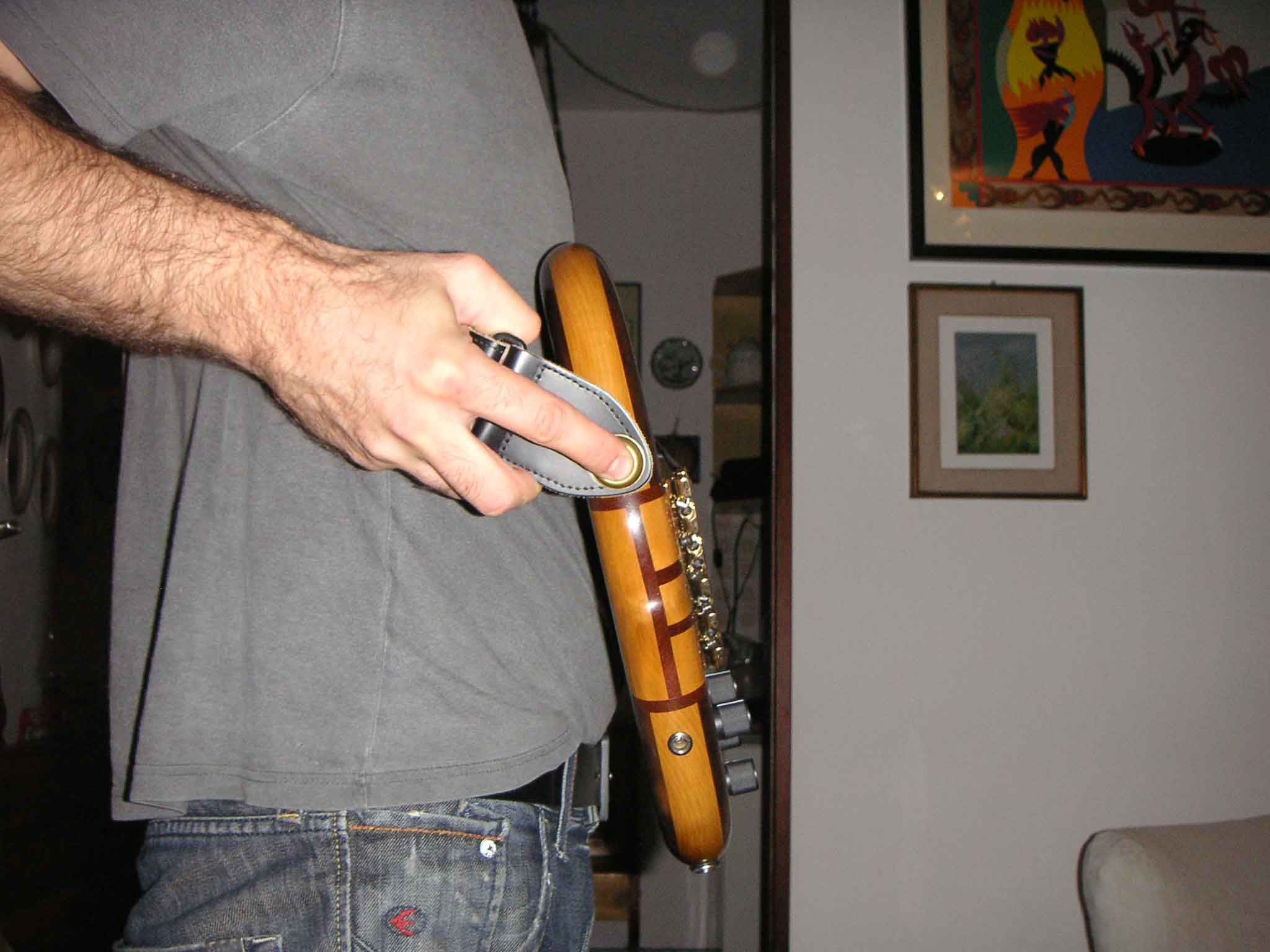 A little example test. Stomach or not if you wear your bass and stand up the bottom edge of your bass will not touch your body.. this won't happen with basses with the straplock in the center of the body like the Yamaha trb6 or I played for long time or almost every bass on the market. (this is probably why I noticed that) ok I did some picture to explain my point: Look at the angle between the bass and the line of the wall behind: or the door here (notice Clifford Brown and the Double Bass bridge in the background..) I don't have a goniometer here but this is almost 15 degrees now see the reduced angle after the modification Now my bass feels really good on my body.. Then this is a pic of my wrist when playing on the E string with the normal Smith strap position you can also see very well that the bass is not straight vertical here, as you can notice when you wear your own Smith Then here the more healty reduced wrist angle with the new strap position. I don't want to look assumptive with that but I've been very careful to posture problems this years after a bad wrist problem and I think this can really help someone. than my beautiful smith feels so much better and easyer to play now.. Please don't think this is a criticism. I think the Smith is by far the best bass ever built and I just love it. It was hard to decide to drill a new hole in my beloved bass, but the result looks very good and I'll fill the original hole with another identical Dunlop straplock.. Last edited by Roberto Zecchinelli; 08-16-2007 at 07:50 PM. |