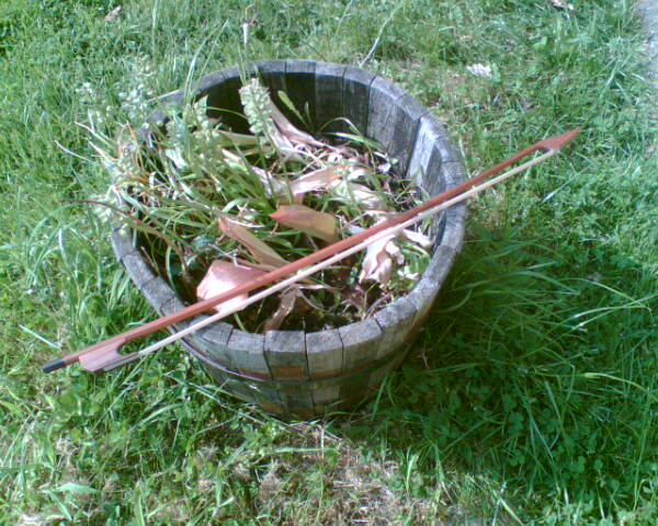 I tend to go for top two plain gut and then bottom two wound, silver on gut. There are camps that prefer copper on gut but for me they just don't hold the tuning as well as the silvers. Sometimes you get silver and copper wraps but again I'm not so much of a fan. The most important thing for me visavis guts is that the top two are WOUND gut rather than just plain (as I used to have, I think they were old pirastros) because it is vastly easier to centre the tuning and find much more centre to the sound with wound strings, for me they just work better. A friend in Europe is trying out the Aquila strings but he hasn't had them very long; I'd like to get some gamuts in the long run as they make them for you and your bass but I'm still in the process of having the actual conversion done and strings are something to think about properly later...I have a set of strings that Pete rather generously gave me to keep me going for now which are a mixture of brands etc, but when the bass is ready I'll be phoning Mr Gamut. I've attached a pic of the bow. Obviously when the hair is tightened the stick bends the other way to modern bows but this one was taken by my non-bass-playing father when it was first delivered to us. I'll get some proper pictures soon. It's a really lovely bow. |