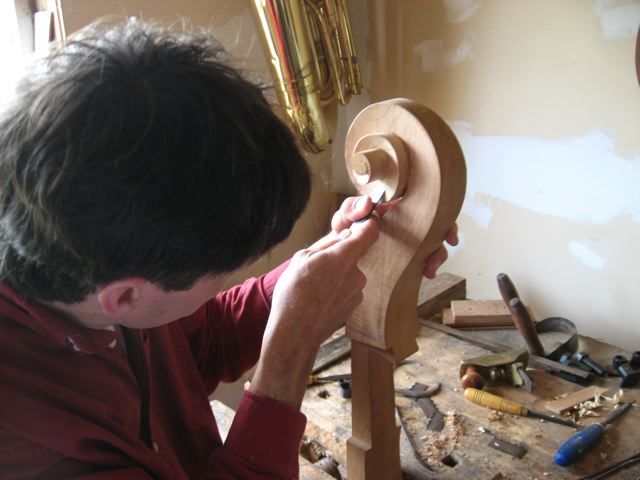 Here is the neck and the half carved scroll, the volutes still need to be carved in.