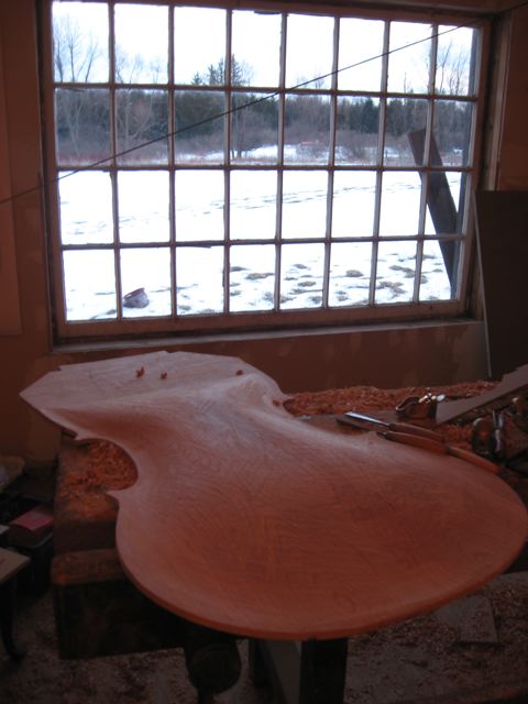 Next up: Leveling the front edges of the rib structure and tracing the bass outline to the spruce top. |