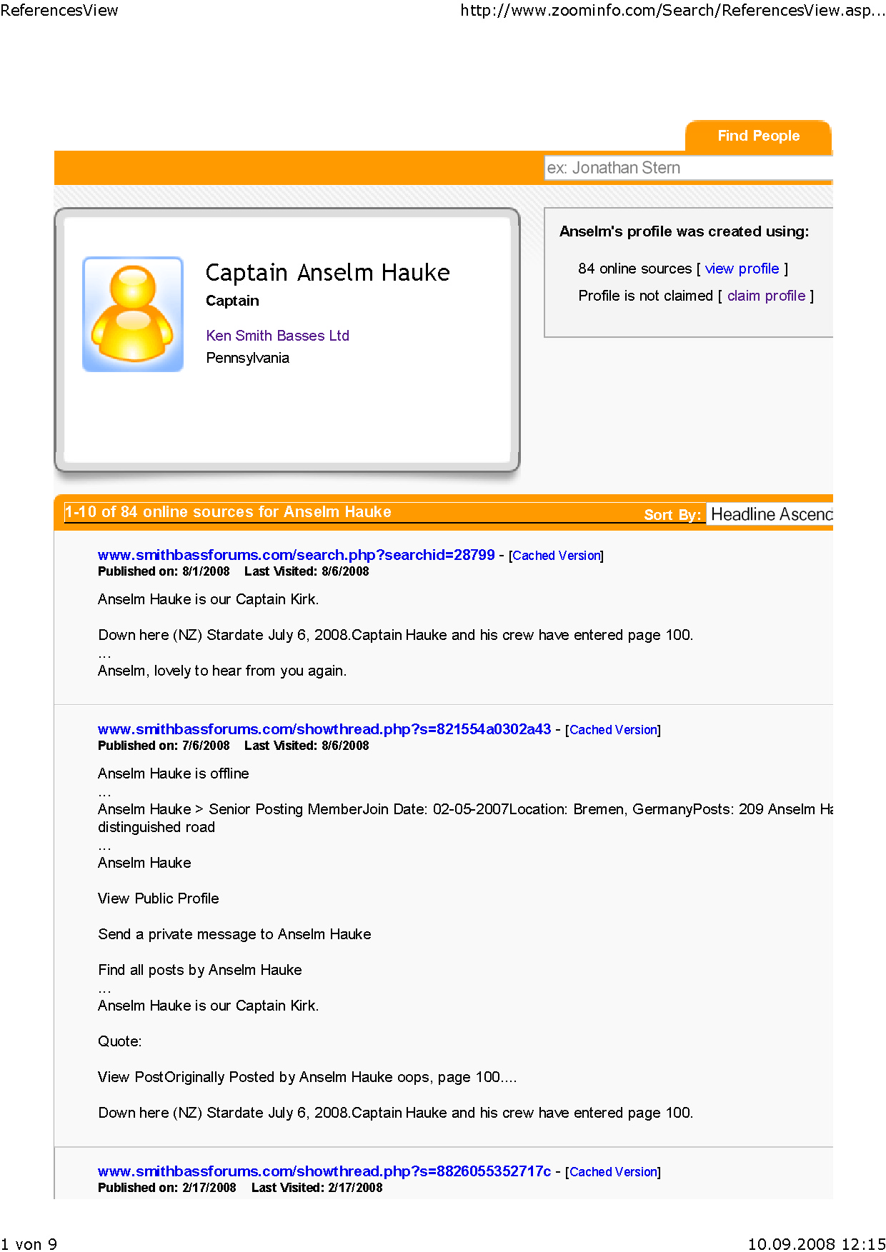 this is a website that works like a search-engine (like google etc.) and makes "profiles" of people you search for, from the websites it finds with your name. if you search for my name, it finds the post from this forum where you called me "captain kirk", and makes me a captain. that´s it. i wonder what zoominfo will make from your post #51 above ![]() |
