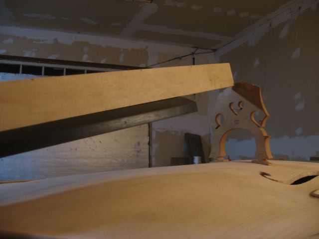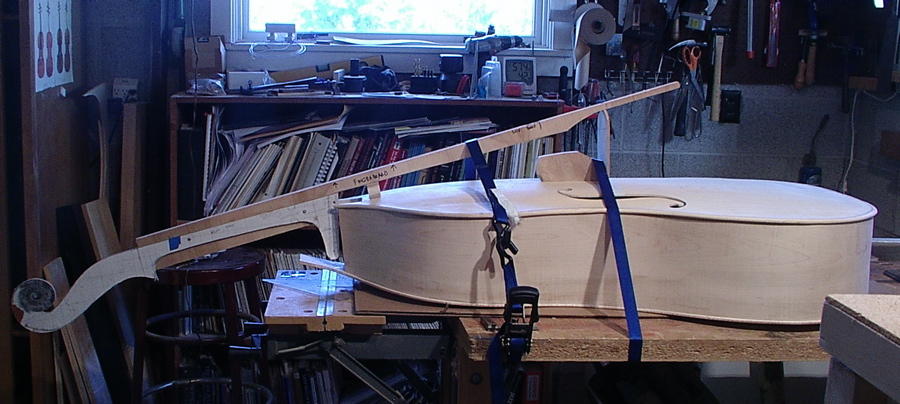 I am in the process of cutting the neck angle and fitting the neck into to the mortise. The finger board in the photo is being held in place with a mock neck. This is to help me figure out all the critical dimensions like over stand, neck angle and bridge ht. Believe me, I'll be measuring more than twice.