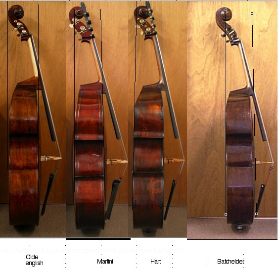 I captured these basses earlier and put a straight line from the back up to the scroll to illustrate the angle differences, then I added the front line to create a "box" where the nut sits inside. I did this last night but didn't post it so here it is. Pretty much the same as yours but with the lines. You obviously don't need the line, you can just look, but it does help define how far the fingerboard is out from the left hand. Question: Is the distance from the imaginary line up the back in relation to the nut (just where the strings exit the fingerboard, a variable to control? When designing or restoring a bass where the neck will be reset the overstand can be varied by adding some wood to the heel (or removing). A bigger overstand will allow the nut to move more away from the imaginary back line and visa versa. This reminds me of the old Sesame Street game "One of these things doesn't belong". Last edited by Ken McKay; 07-13-2009 at 12:54 PM. Reason: clarity |