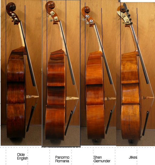 ![]() So, as far as you can see, which basses have the least pitch, most pitch or most comfortable 'looking' pitch in your mind for what you can see. As far as what can be controlled, often in restoring an old bass, the string length is something we try and control in the planning. Making it longer, shorter of keeping it the same. Sometimes they are re-pitched slightly and sometimes not. Some times they are set lower into the block and sometimes just moved out. All of these steps are possible to do but what ever is practical for each bass to achieve the desired results is what will be done. The optimum achievement can only be done with a blank check so to speak. You cannot do this 'on the cheap'. The bass needs what it needs to get it as good as IT can be for today's playing styles. Sometimes it's very little and sometimes it's everything. Here is a list (from what I can remember) of the things that have been done to a few of my basses. Some had one or two steps done and some everything; Scroll/neck Graft, new fingerboard, c-extension, block cut, block expanded, new block, underside heel shim/pitch, re-pitch, fingerboard shim, fingerboard shim/pitch, neck lengthened with graft, neck shortened with graft, bridge moved forward to adjust note stop, heel recarved deeper/smaller, neck recarved shallower, etc.. In other words, what ever it takes to make a particular bass the best that it can be for you. The 'for you' part is a big one. Not everyone wants the same neck or feel. I can't tell you how many basses with D-necks with 'healthy heels' that I wanted cut down into Eb-necks for my personal taste and was talked out of the idea by Arnold because these were basses for sale in my stock. The modern players are trained to play the d-neck classically but for me playing jazz and classical etc., I prefer the Eb for all around playing. Playing the f/1 and g/4 on the A-string are important for me as well as the c/1 and d/1 on the E-string, and not just playing up the bass on the G and D string. I like my reach over the neck and heel from fingered to thumb positions to be as little a transition as possible. This is what I mean by liking the Eb better personally. Others trained on a d-neck may have difficulty playing in tune in that transitional area regardless of comfort in the long run. |