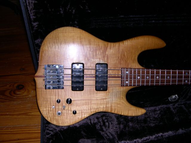 I bought it used back in the late 80's early 90's. It is made of figured maple with mahogany and is stamped "108" on the back of the head stock. It has a Badass bridge, Schaller tuning machines, soapbar pickups, three knobs and two toggle switches, and a rosewood finger board.