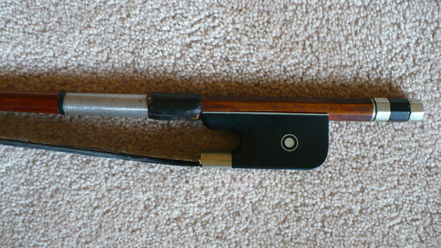I just aquired this nice French bow(formerly my teachers). It appears to be German made with good quality pernambuco. Stick weighs 125g. Playing hair length at 21.5", with a stick length of 26.5"(not including the screw). Despite it being a bit lighter in weight it grabs really nicely and pulls a really nice sound as well. Its one of the nicer playing bows that I have owned. I am posting to see if any of you may have a better idea of where it was made. Anyway, here are some pictures of it: