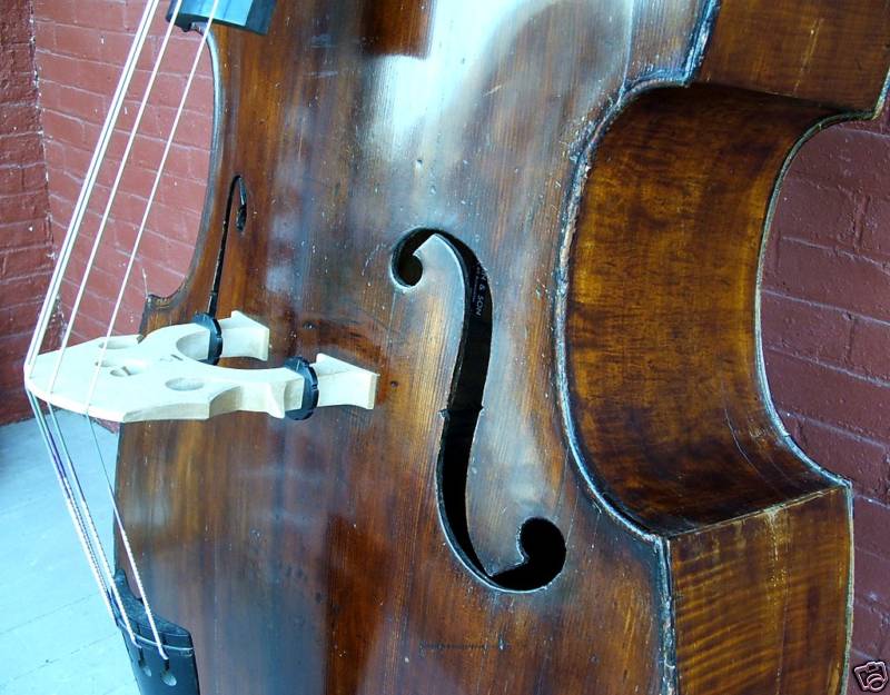 "This Upright Bass is all hand carved from the mid 1800's. Made in the German/Tyrolean area in Europe. Gamba shape with flat-back, inlaid purfling, sides and back are tight flamed maple. Nice medium dark brown "violin" finish. Formerly maintained by "Paul Safran & Son", North 8th St., Philadelphia PA., "Robert Riccardi", Pennsauken NJ., and most recently by Shank's Strings, Elizabethtown PA