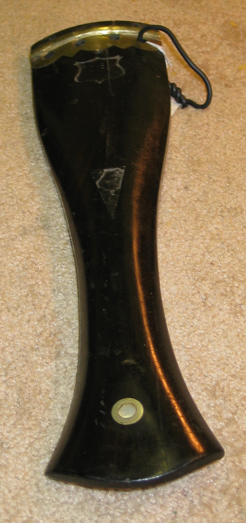 There is a lower brass circle with mother of pearl inlay at the bottom still intact plus an empty cutout from a missing crest at the top plus a center inlay partially filled in. I would love to know what was in there. Always a mystery..