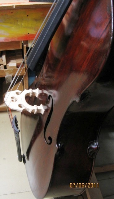 The repair skills needed here were extensive. The Bass was un-playable when I acquired it and only played it for about 30 seconds before de-tuning it and putting it in the rack for repair. I have had this bass for about 3 1/2 years now. A good part of the restoration was un-doing the previous bad work done and re-repairing the Top which was in need of some serious surgery. The job took about 3 years to complete working on the slow side at first and then continuously after all things settled. The main problem was the Top which is usually the most fragile part of the bass.