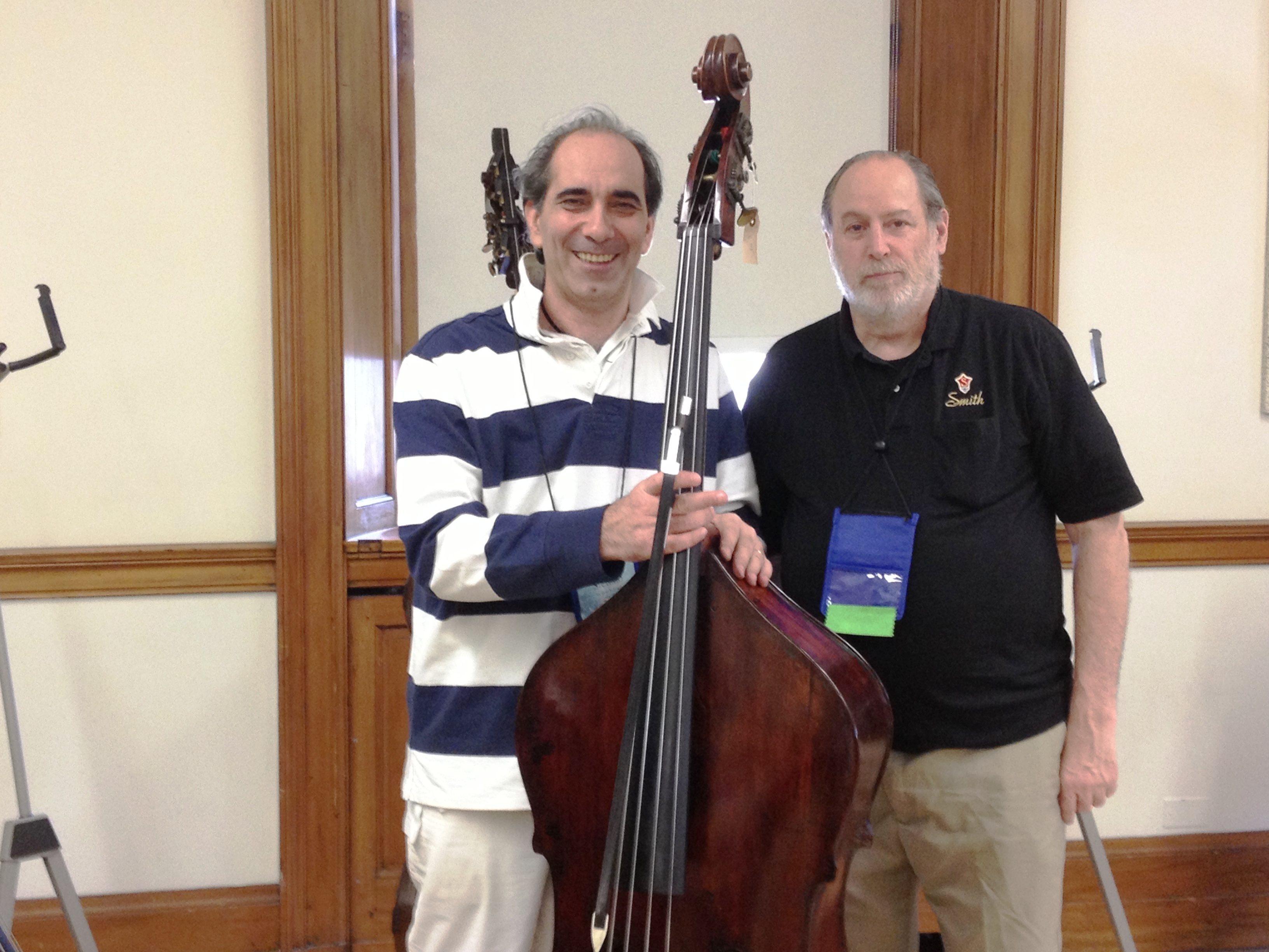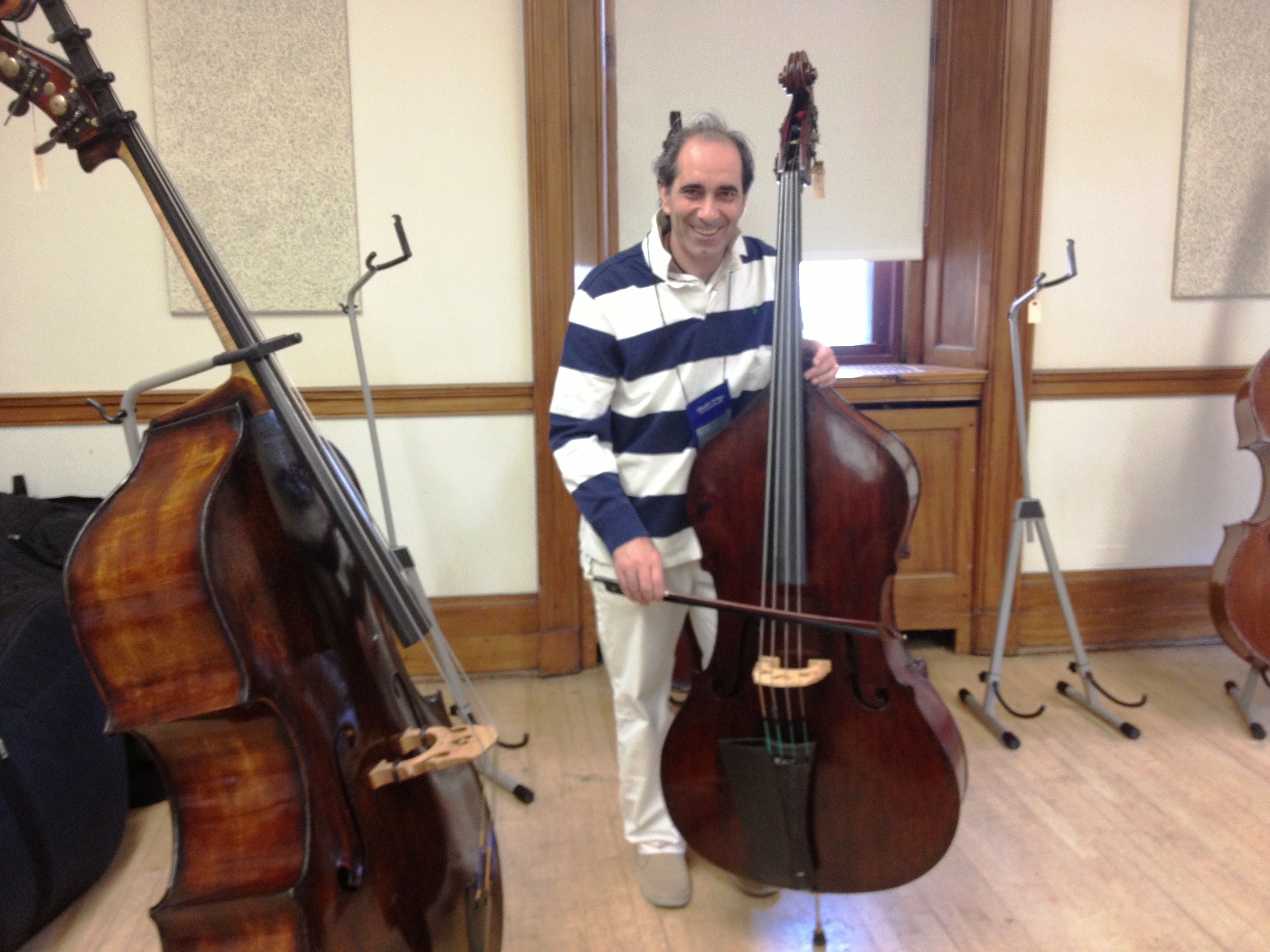 A few days before the show I received an email from Chris Brown, long time principal bassist with the Minnesota Chamber Orchestra (and just retired) and also the author of a book on historical bass bows. At the Penn State ISB in 2009, we ended up displaying in the same room with his collection of Bows and 6 of my basses. For this show, we both requested a shared display location as well. In that email, Chis asked me if I would like to play a part in his recital of a bass quartet. One piece by Charles Ives (the Indian) was arranged for 4 double basses, Voice and Piano. During the rehearsal a day before, he showed me another part we can do with 4 basses as well. Then, there was one more with for 2 basses (Vocal and piano). On all 3 pieces, I was the Pizz guy playing the continuo part but some bowing on one piece and more of a jazz part on one of the other three. So, I was playing at the convention as well. That was fun. Chris has a beautiful old Italian bass and two of the other players borrowed basses from my display, the Panormo school and Panormo copy basses. I played on the Hart. I received a great compliment from Stefano Sciascia who had his sound check right after ours the morning of the concert. The Hart cut thru the other three basses and I was not playing hard at all. One other bassist I know, a principal player of an orchestra down south said that the Hart sounded fantastic. So, I think after that, I have to hold on to it.