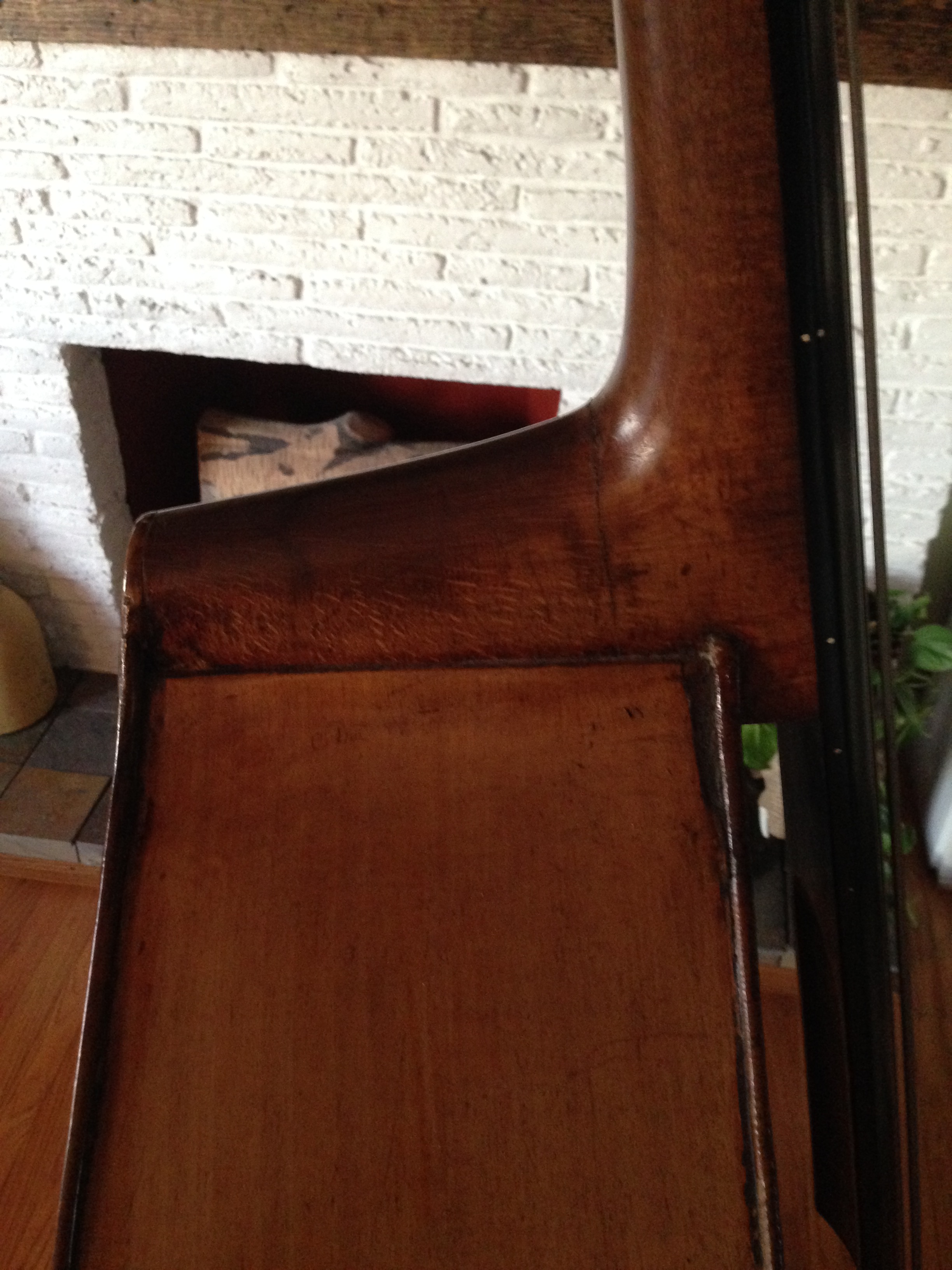 Origin?.. Most likely Germany near Saxony, Berlin or even the Bohemian border area. The tuners look original for basses made from before WWI and even after WWII. Gears can be in stock for decades so it is hard to tell from when the gears were first new. Gear companies do not change designs all that often. After a war, people need things and will buy what is available as opposed to wait for new production. Comments that I have read on TB that German basses have outer linings and Czech/Bohemian basses do not is false. Outer linings take work and basses made on both sides of the Bohemian border that bore various brand names once arrived in USA or other destinations could have been made in combination with both sides of the border. So, it is Germanic. Similar basses were made in Austria as well but not as far east as Vienna or as far east in the Czech lands as Prague. Prague and Vienna produced mainly flatback instruments. This is/was a common type commercial style bass. The French comment is close because similar basses were made in France but the upped back area looks German. Also, the back wood looks more like what the Germans used rather than the French but, that's no method of ID as Wood can come from anywhere. |