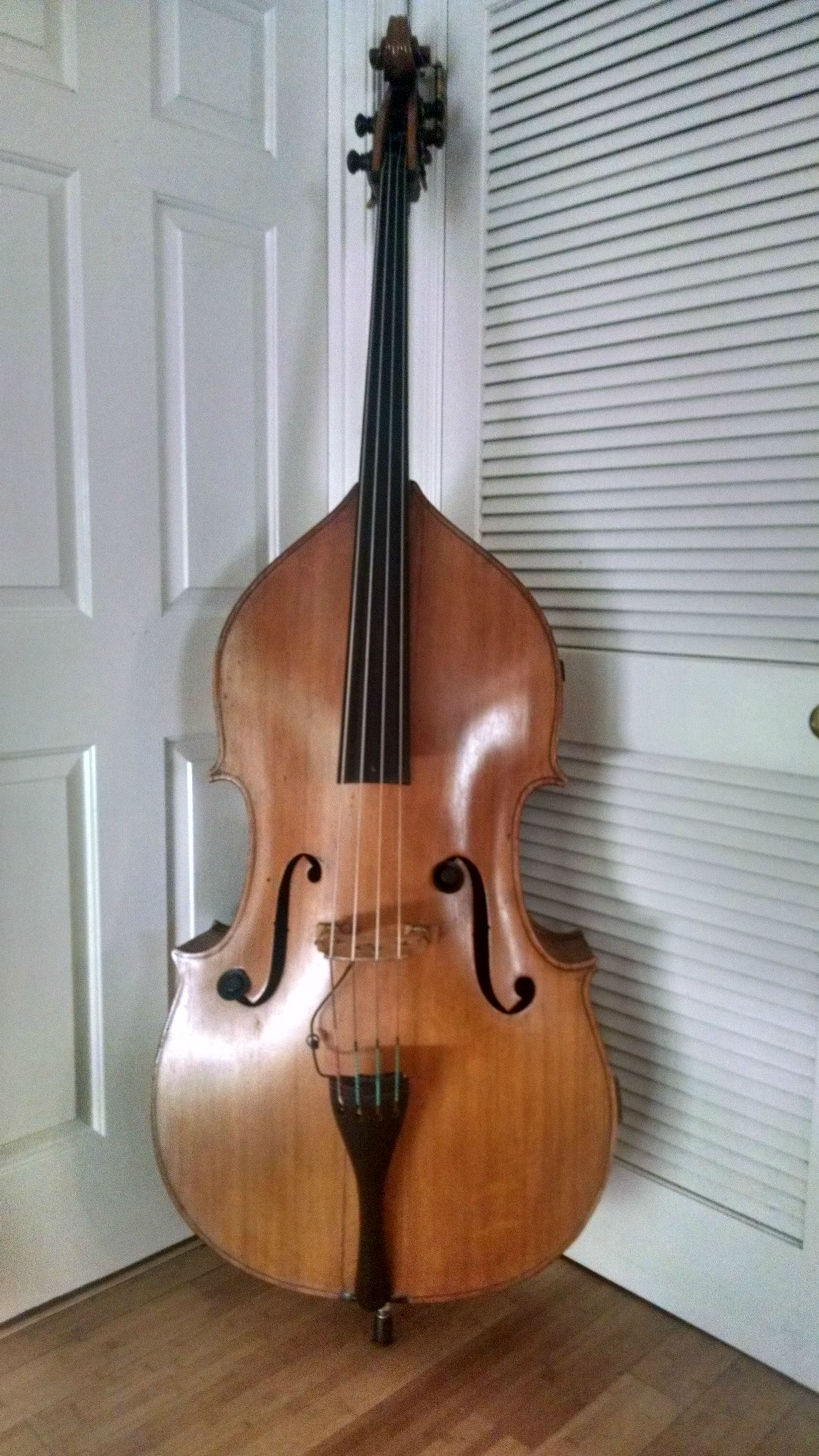 So I bought my bass from Tom Wolfe's in Virginia about 2 years ago but have never been able to get much info about it's origin. The best Tom figured, it was a German bass from around the 1920's. No maker's mark just a repair label on the inside. The varnish is not original and though it looks cool, it was an uneven job. Measurements: Scale 33 1/4 in. Rib Depth: 8 1/4 in. Upper Bout: 19 in. Mid Bout: 15 in. Lower Bout: 25 in. Here's a link to an album with a ton of pictures of it if you are curious: http://imgur.com/a/qxsIY#18 Thanks for looking and also for any info you may have! -MS |