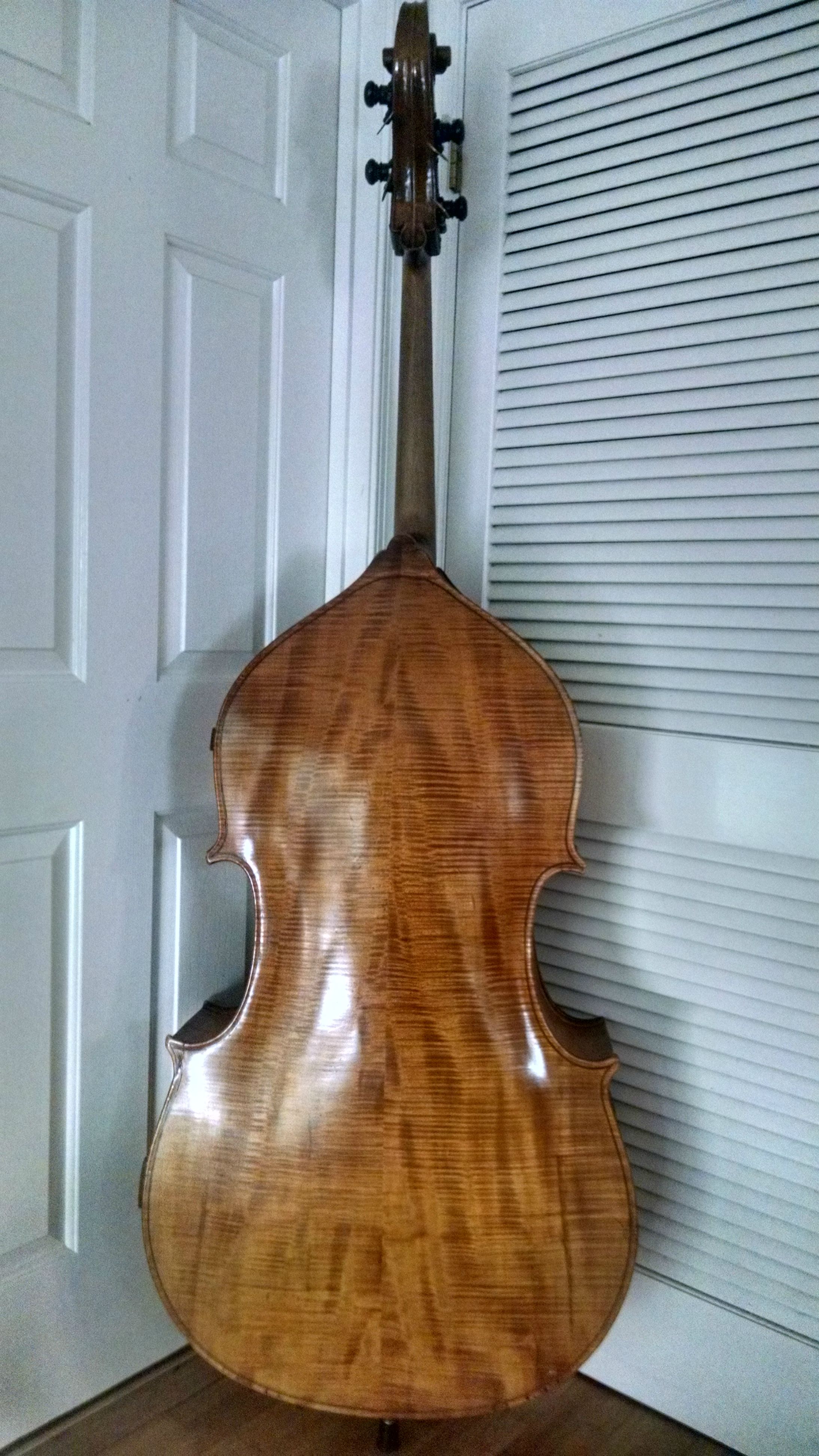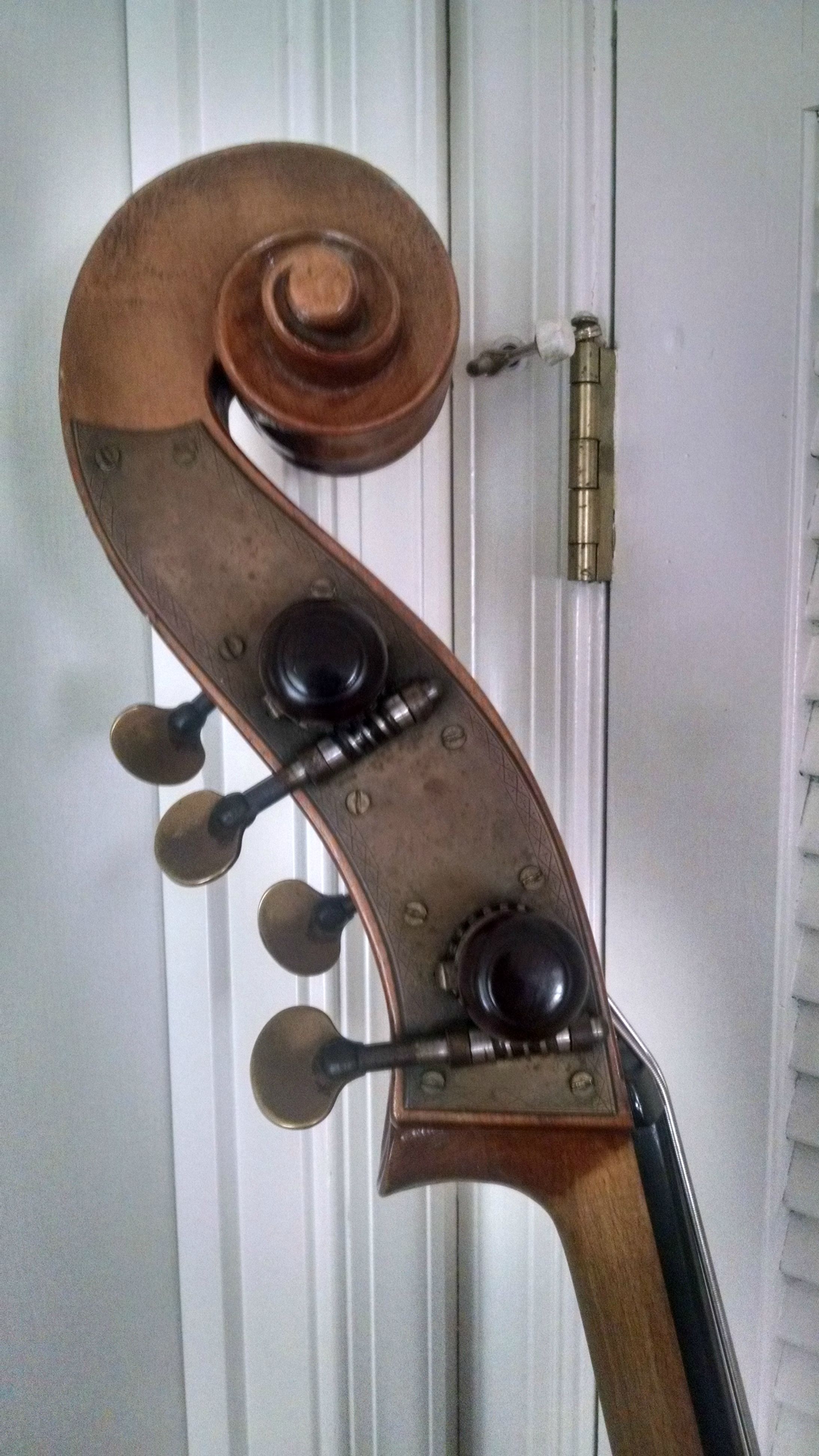 Being a violin cornered round back with sloping shoulders makes it a nicer grade bass. Mainly the wood, and corners. With the varnish re-done its not easy to tell if it was an oil or spirit or what color it was before. Regardless of the varnish, I think the Saxon area pre or post war is the ball park. I think it would be possible to use old pre-war machines on post-war basses IF that's what the shop had left over in stock. On the string length (mensur or scale length for guitar people), if it is 43 1/4, then possibly pre-war as many 3/4s from the the late 19th to early 20th centuries were made a good inch or so longer in playing length than post war basses were made. I have seen 41s as well with older Bohemian flatbacks or roundbacks but many of the German made basses were long. As far as an actual maker if there even was a maker or shop, I have no idea. The Germans made so much of the same thing for over 100 years that without a label that is authentic, you will never know. Also, even with a label, it could be a brand or shop label and not the maker or shop where it was made. |