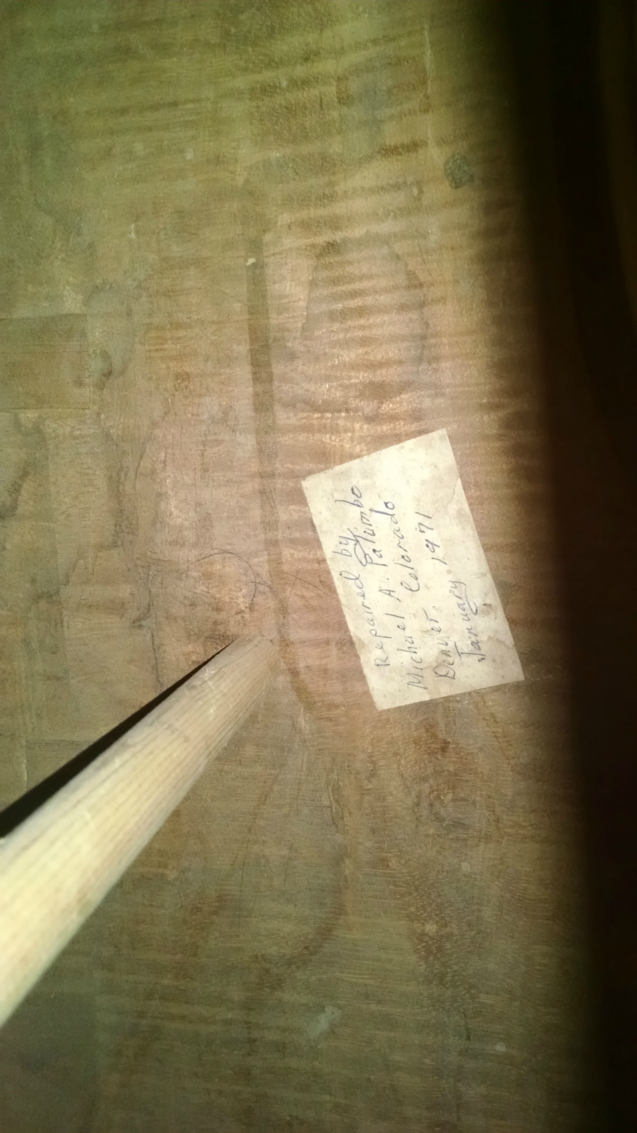 Thanks for all the info. I had a feeling that who made it would be lost to time I just wanted to hone in on the region a bit. I don't know if you saw the label that was in there (attached at the bottom of this post) but I've always figured that it never had one and the repairer from the 70's just put a new one on. Appreciate the help once again for helping with my history itch about this bass. |
