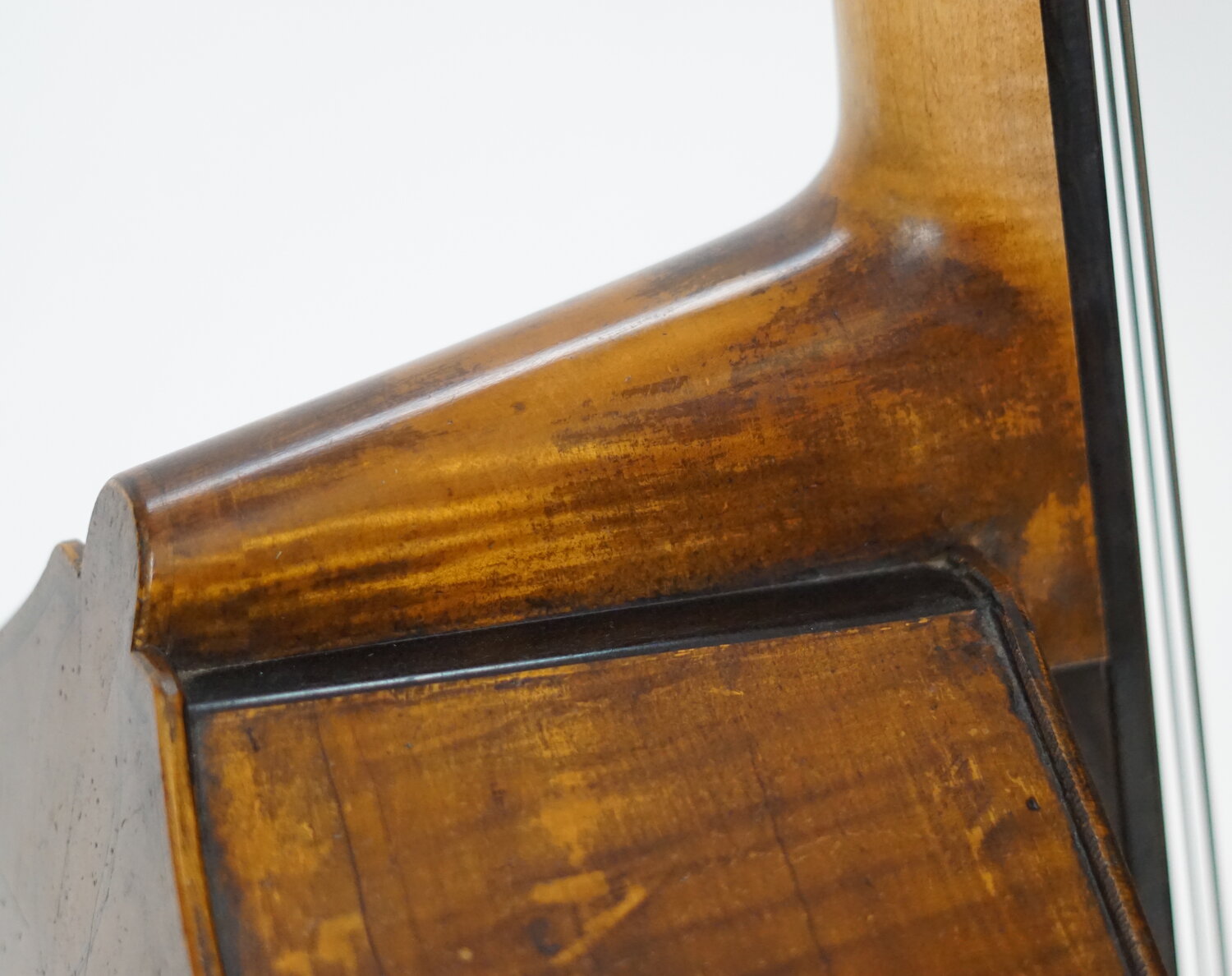 I have seen many basses made by 19th century makers from New York to Maine. New Hampshire was the most famous place for basses in the 19th century by Prescott and his followers, as well as a few before him. This Gemunder bass looks to be of Italian-German design. Many of the makers settling in New England and New York came here from Europe, some with ancestry from England. Gemunder being a full German, did what the Germans did back in the day, Copy the Italians! To me, I see a Neapolitan influence here in the design. The sound, post-restoration is more Italian than anything German that I can recall. Pre-restoration in distressed condition, it was smooth and deep sounding but was in no condition to be tuned to pitch for more than a few minutes of testing at most.