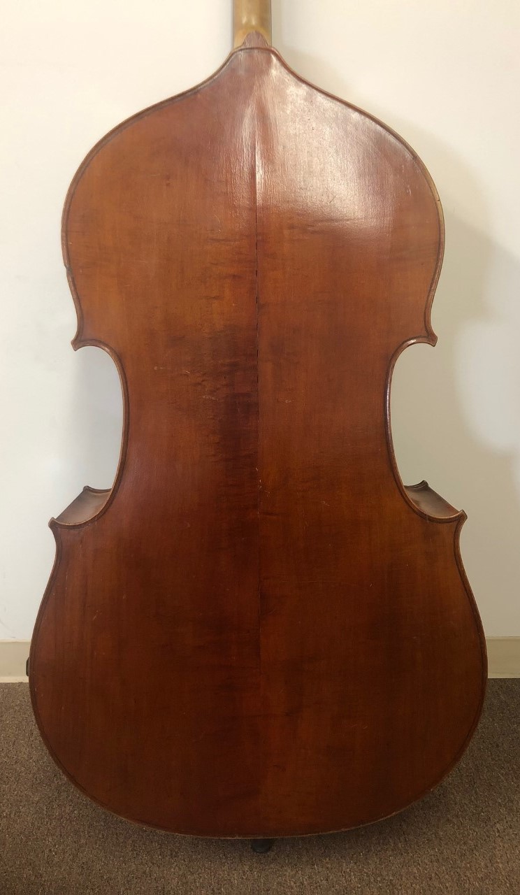 This is a beautiful French Bass, Paris/Bernardel School c.1900-1920 (attributed to the shop of Léon Bernardel (1853–1931)). Unlike the Mirecourt school where just about every violin cornered bass has the Purfling going around both the upper top and back as well as the back false Cello button, this violin cornered bass is clean and simple. The quality is in the simplicity of the beautiful craftsmanship. Originally made as a 3-string bass, possibly for the English market. The original varnish is of the best quality I have seen on a French bass.