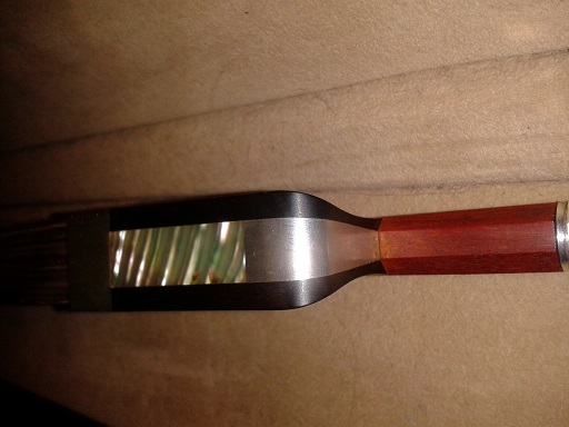 The bow plays beautifully and is very nimble for all techniques. Weight: 134 grams. Length of Stick from Tip (not including Screw): 26 9/16" (27 7/16" with Screw) Playing Length of Hair: 21 1/8" Here are some pics showing his beautiful workmanship |