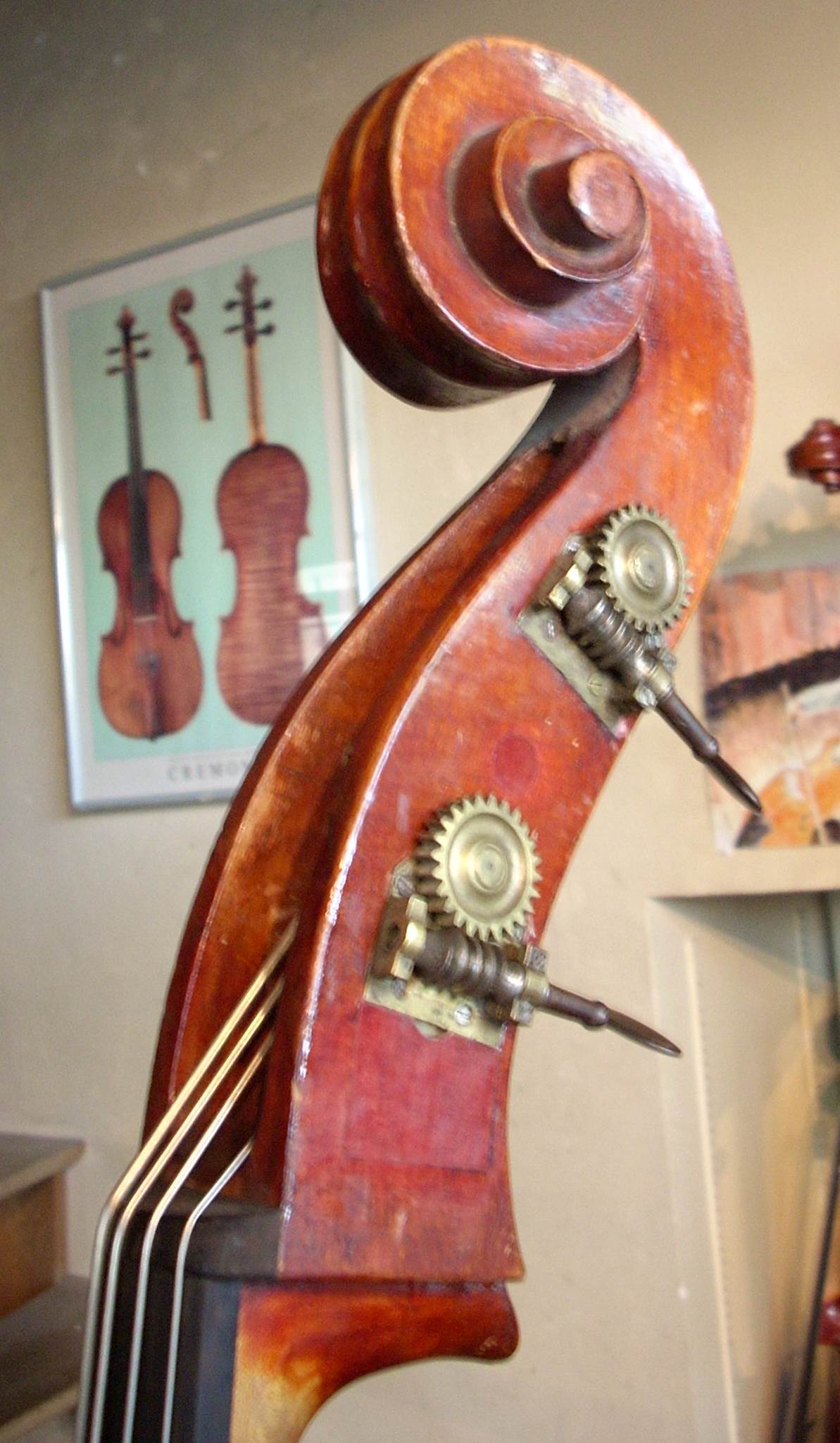 Anselme, that's an interesting pegbox with its open back - don't see them very often. Also the spacing of the machines in two "pairs". Do you remember what bass that was? I've only see machines installed like that by another local maker. |